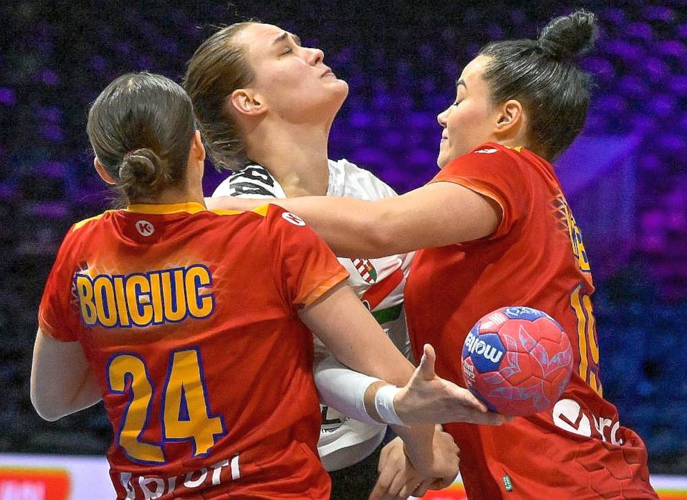 Kuczora Csenge (k) és Alisia Lorena Boiciuc (b), valamint Marya Skrobic (j) a német–holland közös rendezésű női kézilabda-világbajnokság középdöntőjének 1. fordulójában játszott Magyarország – Románia mérkőzésen Rotterdamban 2025. december 3-án Fotó: MTI/Szigetváry Zsolt