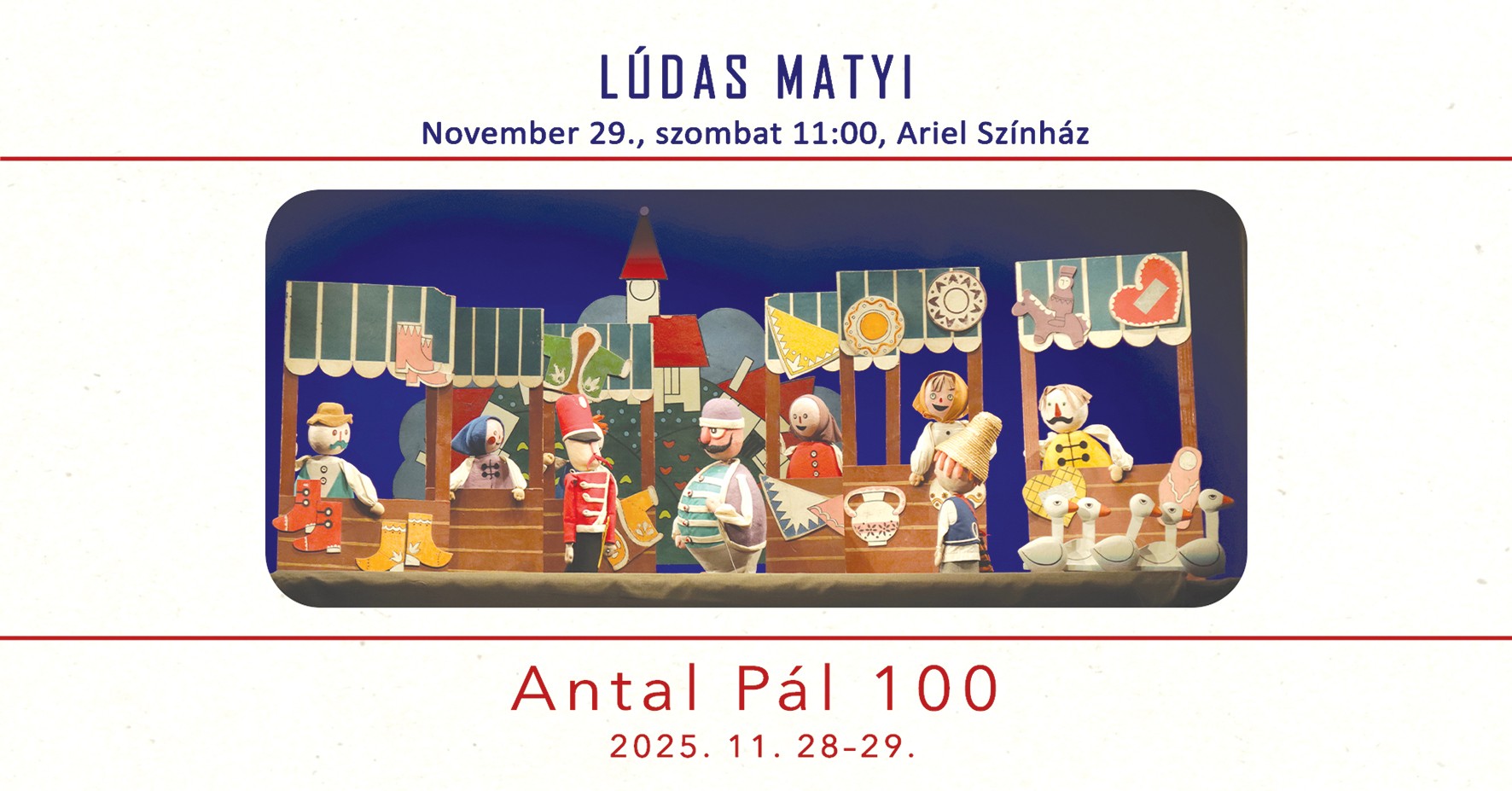A marosvásárhelyi Ariel Ifjúsági és Gyermekszínház kétnapos eseménysorozattal emlékezik a száz éve született Antal Pálra, a marosvásárhelyi bábszínház alapító tagjára, színészére, rendezőjére, társulatvezetőjére és nem utolsósorban igazgatójára. November 28-án, pénteken 11 órától a Gabi és a repülő nagypapa című mesejáték látható a nagyteremben, Vidovszky György rendezésében. 29-én, szombaton, szintén 11 órától az Antal Pál rendezte Lúdas Matyit játssza a társulat a nagyteremben. 15 órától a stúdióteremben Antal Pál 1982-es rendezését, A kék madár című előadást vetítik le. Ez a programpont felnőtteknek ajánlott, a belépés ingyenes. 16 órától szintén az Ariel Stúdióban Novák Ildikó Bábszínházi és színházi látleletek. 20-21. századi romániai magyar közelkép című kötetét mutatja be Ungvári Zrínyi Ildikó, a belépés ingyenes. 17 órától Antal Pál 100 címmel megemlékezésre és posztumusz könyvbemutatóra kerül sor a stúdióteremben, ahol többek között Smaranda Enache, Nagy Miklós Kund, Novák Ildikó és Kovács Levente idézi fel Antal Pált, az alkotót és az embert. Antal Pál Lágernapló című könyvét Káli Király István és Spielmann Mihály mutatja be. A belépés ingyenes. November 28-án és 29-én online megnézhető Antal Pál három meghatározó, felnőtteknek szánt rendezése – A kék madár (1982), A kis herceg (1986) és az Oh Romeo... oh Júlia... (1995) – a következő linken: www.teatrulariel.ro/magyar-tarsulat/news-hungarian/archiv/antal-pal-videok.