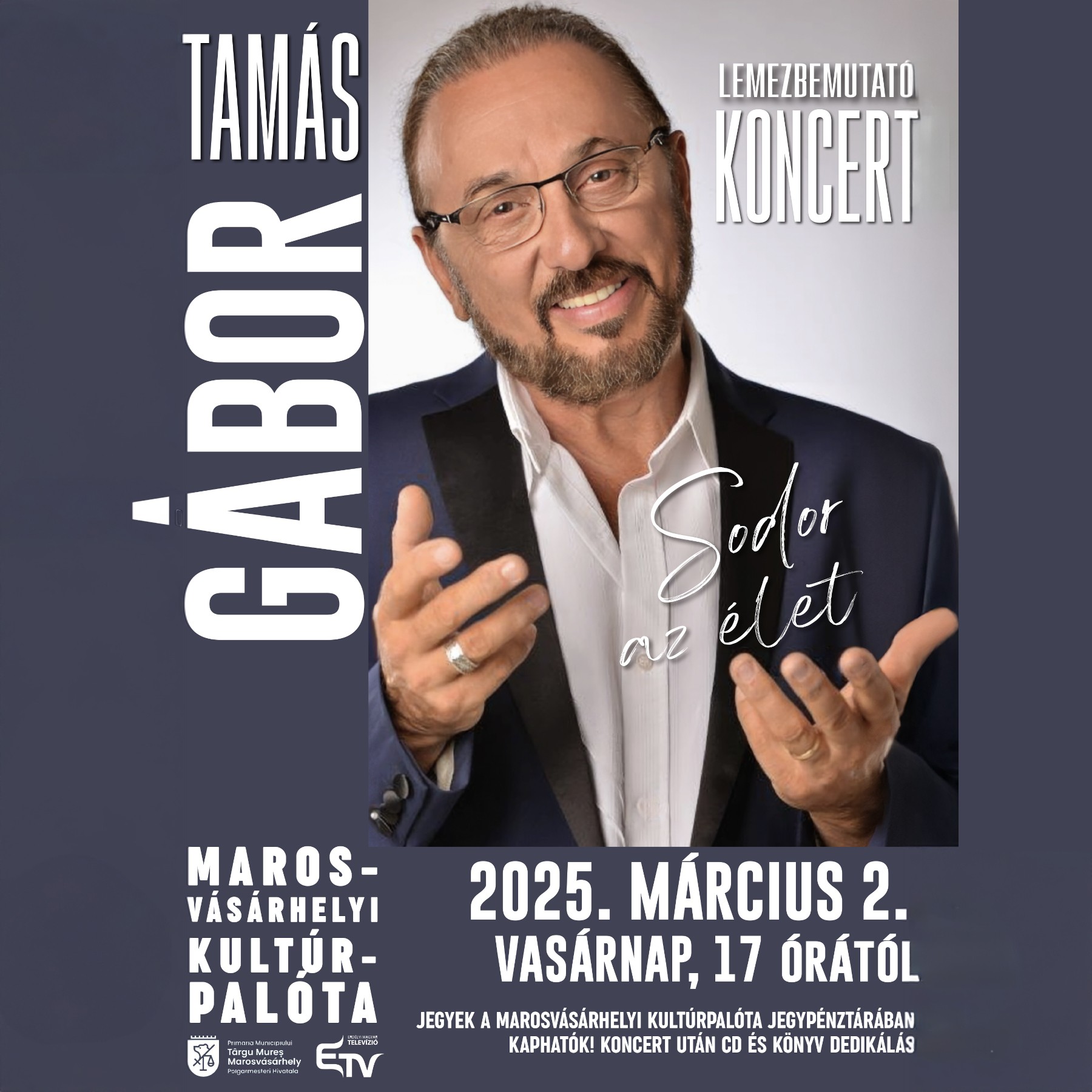 Immár hagyományosan, 2025. március 2-án délután 5 órai kezdettel a marosvásárhelyi Kultúrpalotában kerül sor Tamás Gábor Sodor az élet című új nagylemezének bemutató koncertjére, amelyet 1994 óta kétévente szerveznek meg városunkban.