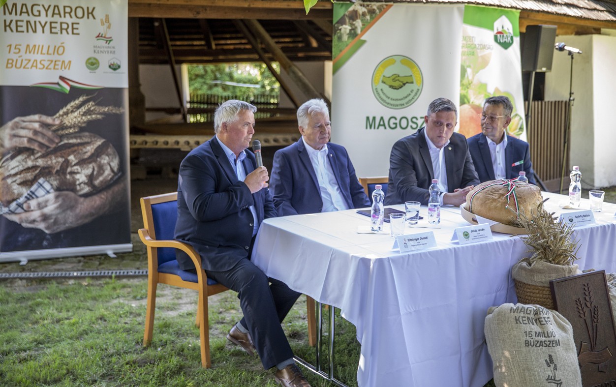 Rittlinger József, a Magyarok Kenyere Alapítvány Kuratóriumának elnöke, Jakab István, az Országgyűlés alelnöke, a MAGOSZ elnöke, Győrffy Balázs, a Nemzeti Agrárgazdasági Kamara elnöke és Babák Mihály polgármester (b-j) a Magyarok Kenyere – 15 millió búzaszem program sajtótájékoztatóján Szarvason