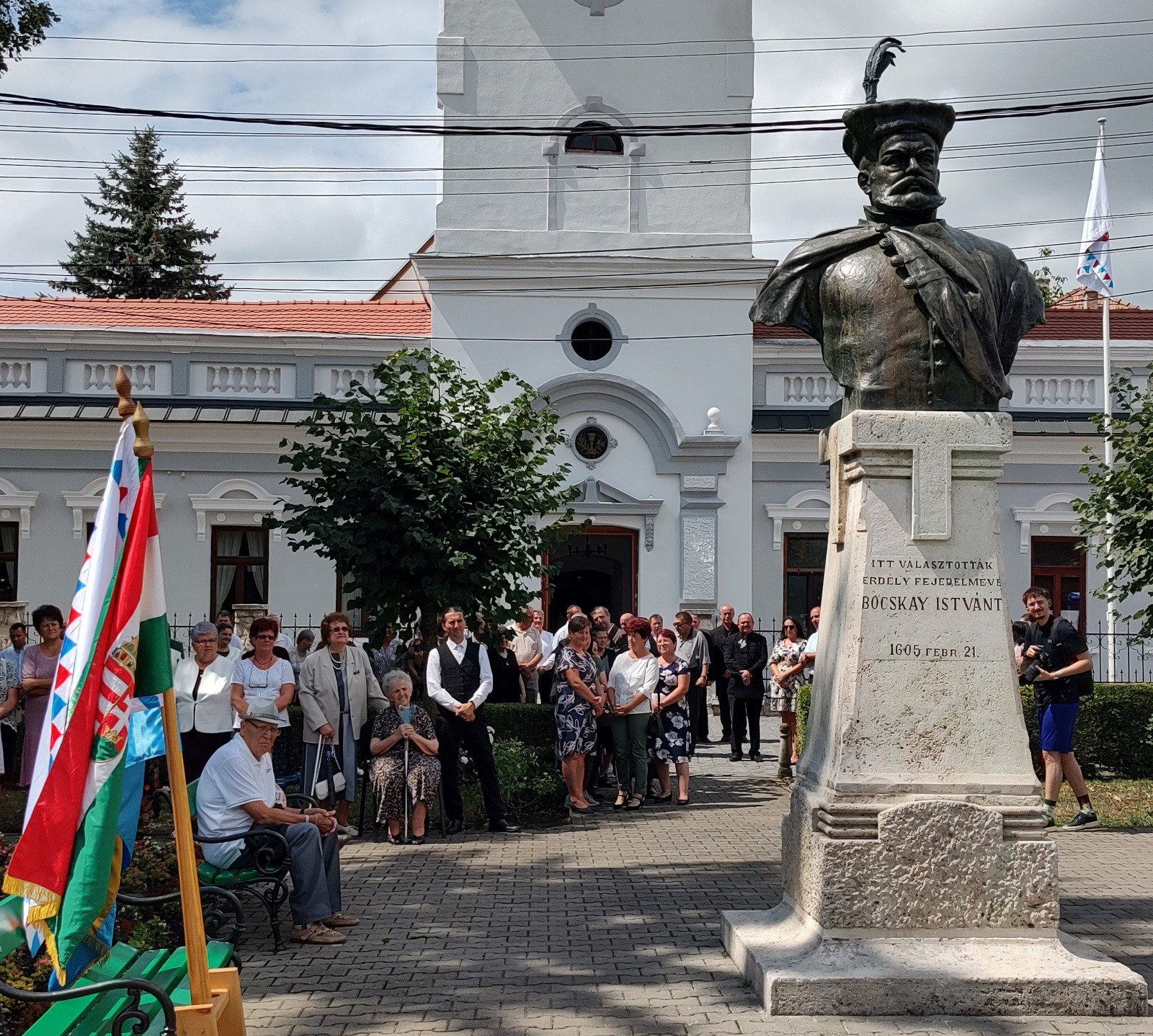 Az ünnepi pillanatokat színesítette dr. Molnár Tünde marosvásárhelyi orgonaművész játéka (Liszt Ferenc: Tu est Petrus, Louis Cloude Daquin: Kakukk és J. S. Bach: Jertek, ti keresztények, áldjuk őt! című darabjait adta elő – szerző megjegyzése), illetve Kolozsvári Zoltán presbiter szavalata (Sas Ede: Krónikás ének Bocskai Istvánról). Jakab Emese unitárius lelkész imája és nemzeti himnuszunk után a templom előtti téren álló, a református gyülekezet tulajdonát képező szobor körül sorakozott fel az ünneplő közösség, ahol Tőkés Attila lelkész a Horváth Géza marosvásárhelyi, de akkor már Budapesten élő szobrász által a „szegény székely nép filléreiből” elkészített, kétszeres életnagyságú Bocskai-szobor hányatott sorsát ismertette.