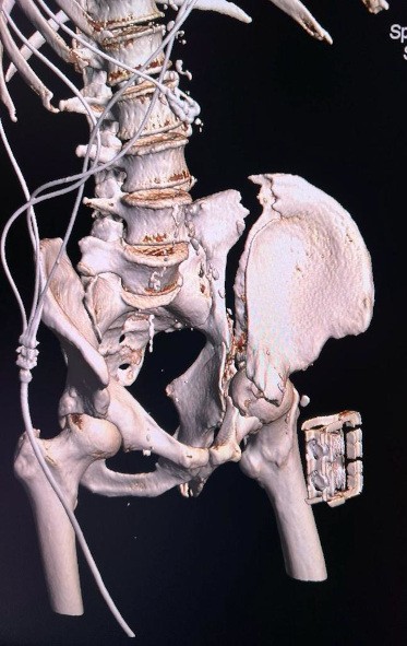 Az oszteoszintézis-műtét során a beteg törött medencecsontját csavarlemezes egyesítéssel állították helyre.