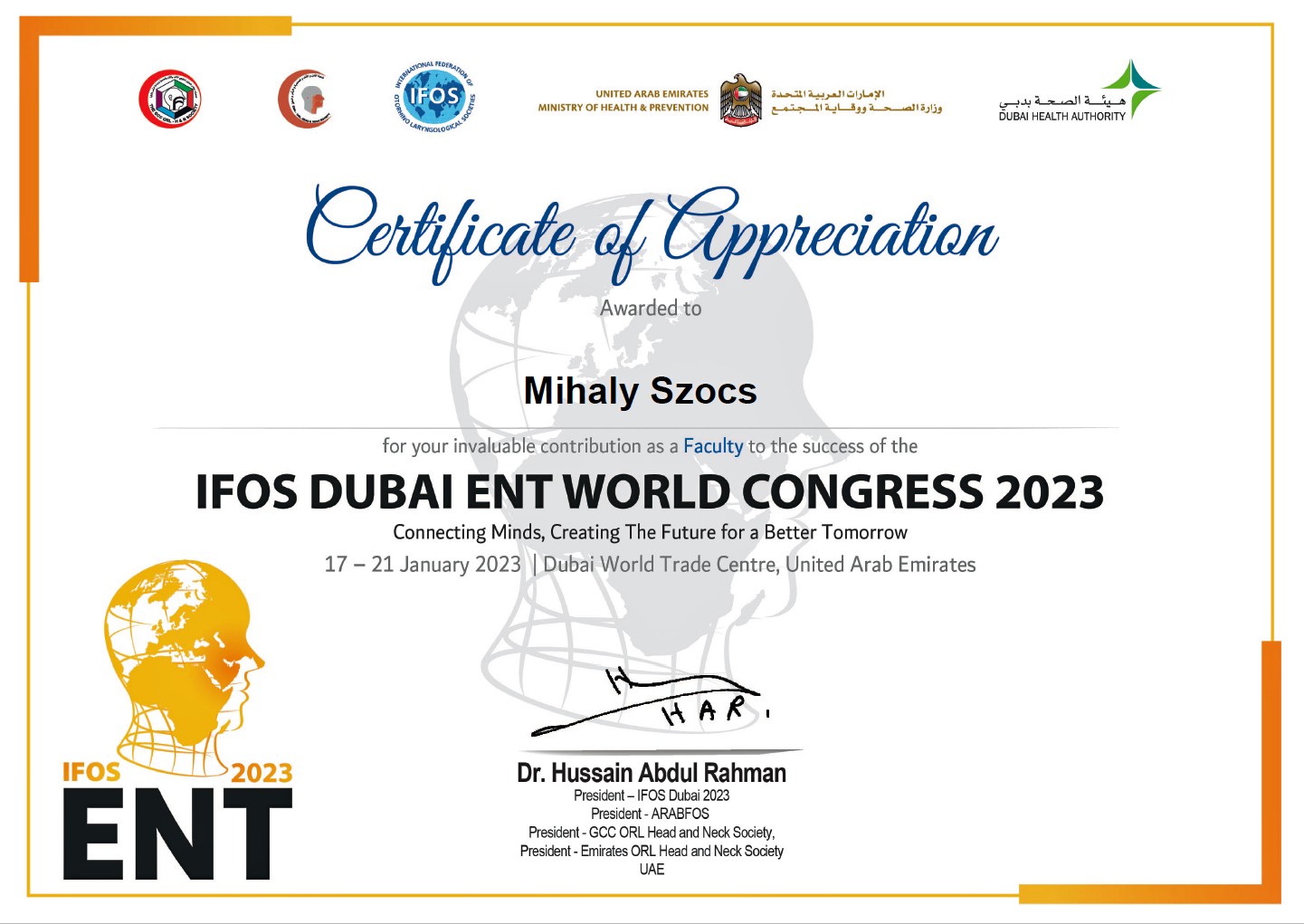 Ha a tudományos bizottság úgy dönt, hogy a dolgozat tartalma figyelemre méltó, akkor egy vagy több órán át tartó prezentációt javasol a bemutatására, eltérően a szokásos nyolcperces prezentációtól, és a szerzők a kongresszus „előadójává” (Speaker) vagy „oktatójává” (Faculty) válnak. Meglepetésemre az IFOS tudományos bizottsága úgy határozott, az általam beküldött három dolgozat közül bármelyik megérdemel egy egyórás prezentációt, nevezetesen „fő előadást” (Keynote lecture) vagy „gyakorlati képzést” (Workshop), én pedig kiválaszthatom a három közül azt, amelyik számomra jobban megfelel. A harmadikat választottam, és Az arteria supraclavicularis fasciocutan lebennyel szerzett tapasztalataink című dolgozatot egyórás workshop előadás formájában mutattam be. Így lettem „Speaker” a világkongresszuson. A másik két dolgozat mint ePoster került bemutatásra. Romániából egyetlen fül-orr-gégész kolléga sem részesült ebben a kitüntetésben. Figyelembe véve az IFOS méretét és szintjét, úgy gondolom, hogy ezt a lehetőséget tekinthetem pályfutásom egyik csúcsának.