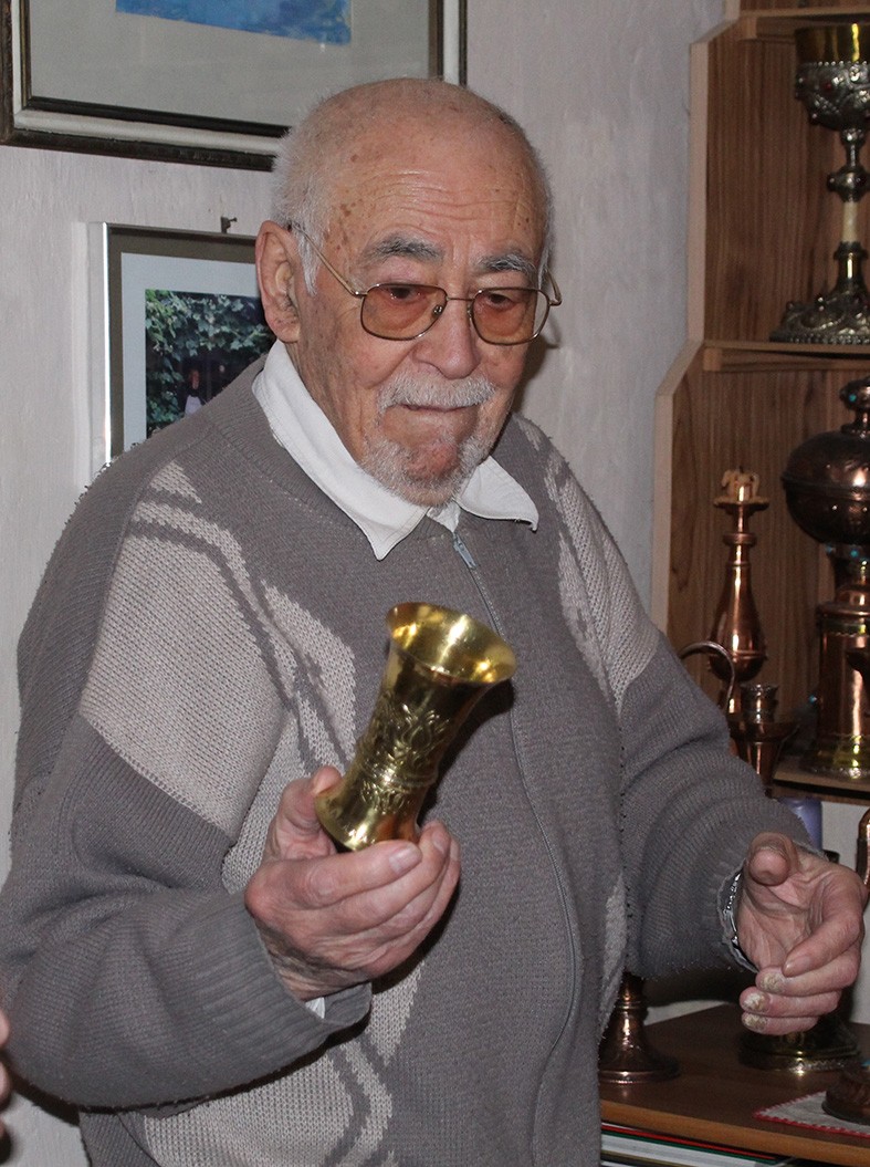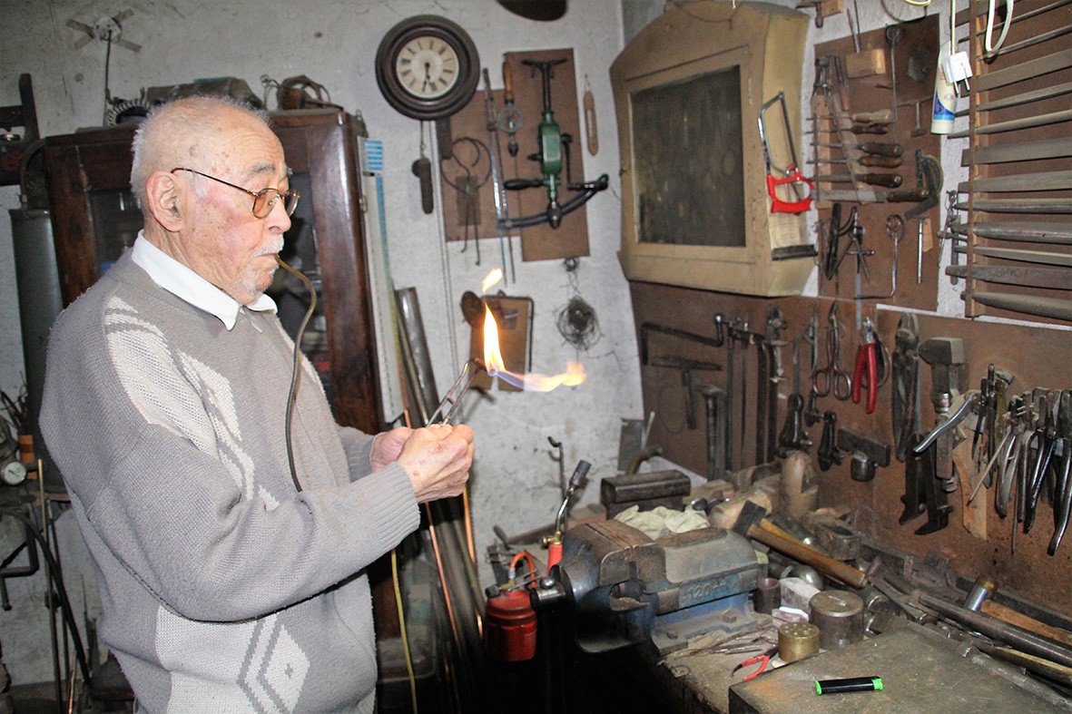 – Több mint egy éve abbahagytam – mondja a műhelymúzeumnak beillő helyiségben, ahol a rezet formáló lángot még meggyújtja a fénykép kedvéért. Olvasok, keresztrejtvényt fejtek, ezzel ütöm agyon az időt – teszi hozzá, amire csak azt lehet válaszolni, hogy rászolgált a pihenésre, hiszen éveken át nem az időt ütötte agyon, hanem a rezet idomította, formálta sok-sok kalapácsütéssel.