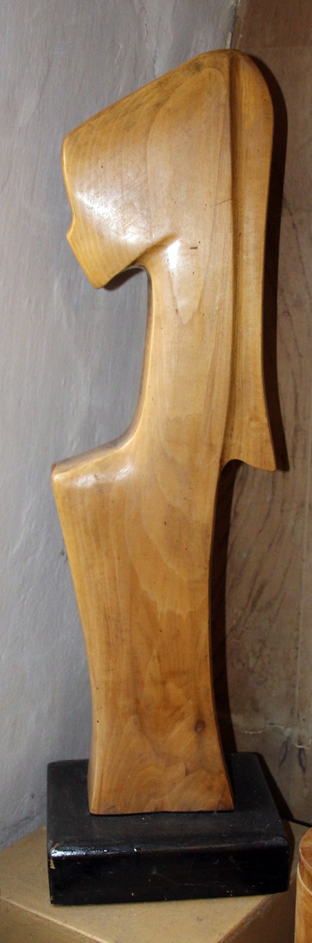 A lakásban levő szobrokból ítélve, a fa iránti első szerelem sem múlt el a fémmel való sikeres találkozás után, és sokoldalúságát a tulipános faliszőnyeg és a kettőbe vágott üvegpalackokból készült lámpaernyők is bizonyítják. A fából készült alkotásokból ítélve kár, hogy a szobrászatot nem folytatta tovább.