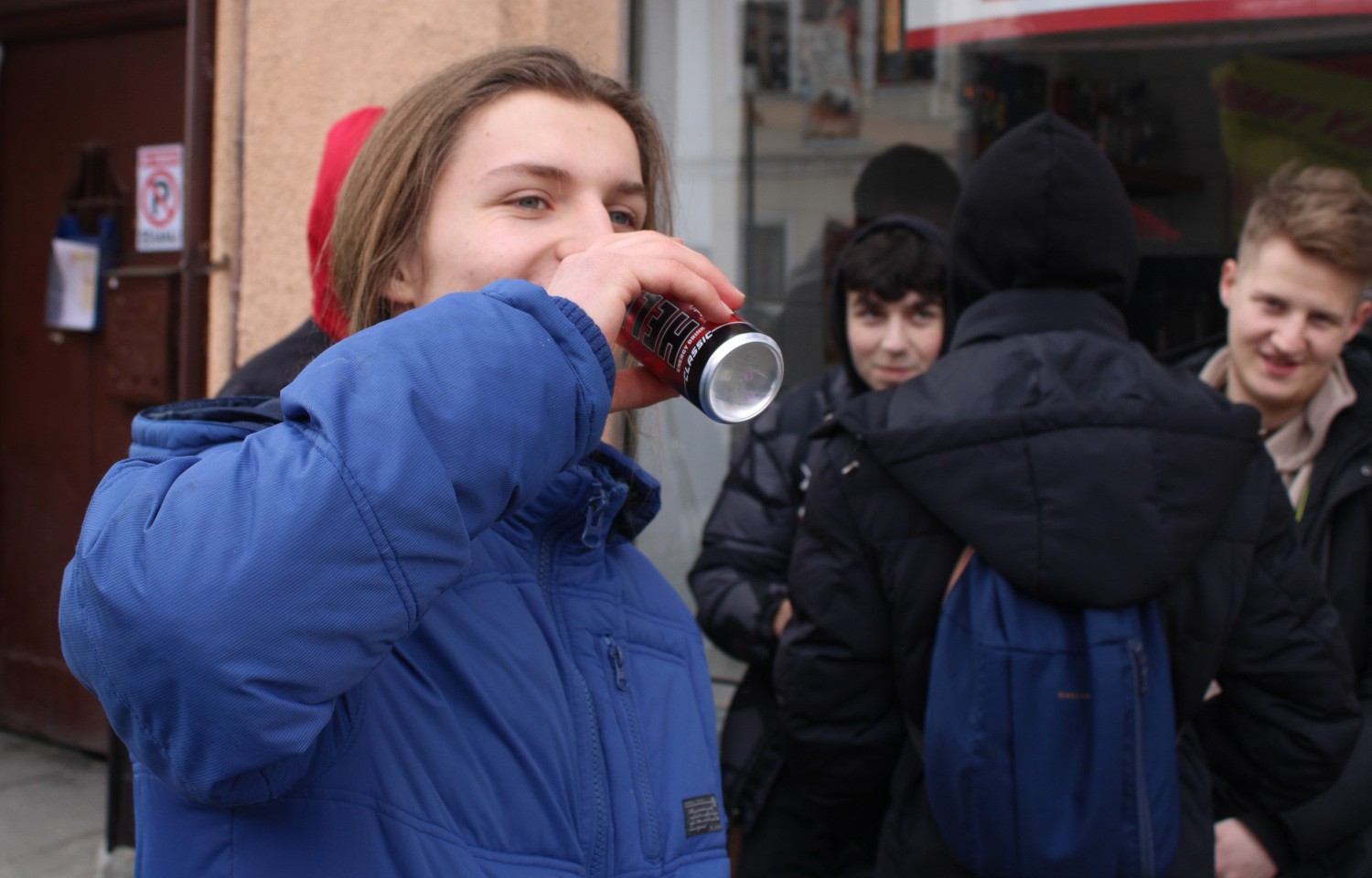 Egy közeli kisbolt előtt egy olyan fiatal is szóba állt velünk, aki éppen energiaitallal „doppingolta” magát. Készségesen hagyta, hogy lefotózzuk, hiszen ő már 18 éves, neki szabad a tiltott „gyümölccsel” élni.
