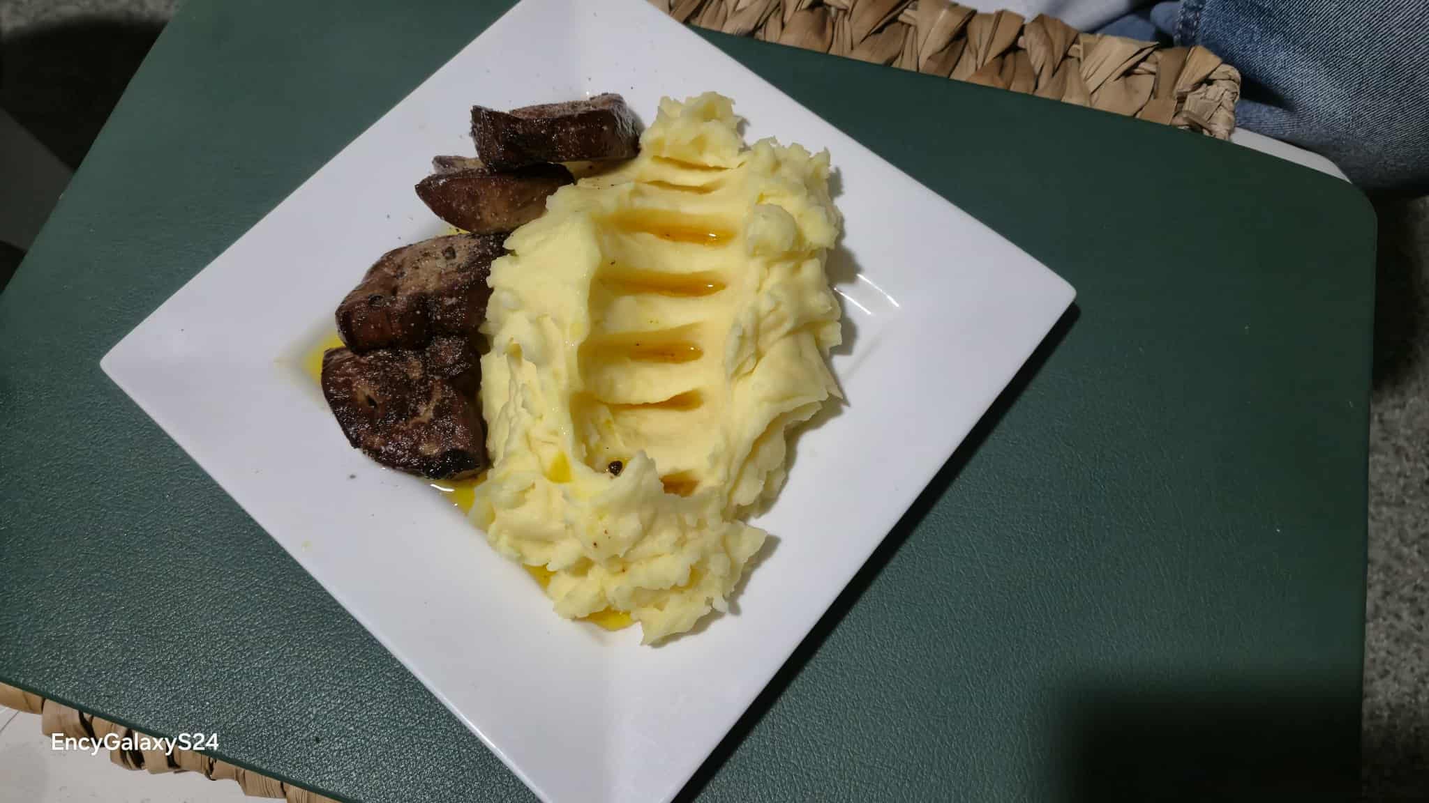 A nagy, aranysárga kacsamájat először óvatosan ellenőrzöm, nincs-e rajta hártya, amit le kell húzni. Nem mosom, csak papírtörlővel leitatom róla a nedvességet, hogy szépen süljön majd. Egy kisebb lábasban lassan felolvasztom a kacsazsírt, adok hozzá egy kevés vajat, hogy selymesebb legyen az íze, valamint egy kis ág rozmaringot. A zsiradékot közepesen alacsony hőre melegítem, mert a máj akkor lesz igazán krémes és puha, ha lassan készül. A nagy kacsamájat egészben teszem a zsiradékba. Nem engedem hirtelen sülni, hanem hagyom, hogy a lassú hő átjárja. Időnként finoman átfordítom, és közben folyamatosan locsolgatom a szafttal és zsírral. Így lesz egyenletesen aranyszínű és omlós, anélkül, hogy kiszáradna vagy szétrepedne. Közben elkészítem a krumplipürét: a burgonyát puhára főzöm, majd vajjal és forró tejjel simára keverem. Nem készítem túl hígra, hogy jól illeszkedjen a máj ízéhez. Amikor a máj teljesen megpuhult, és gyönyörű aranyszínt kapott, óvatosan kiemelem a zsírból. Vastagabb szeletekre vágom, és a tányérra halmozott krumplipüré mellé teszem. A tetejére mindig csorgatok egy kanállal a saját zsírjából. A májat én tálaláskor sózom és borsozom. Nagyon finom!