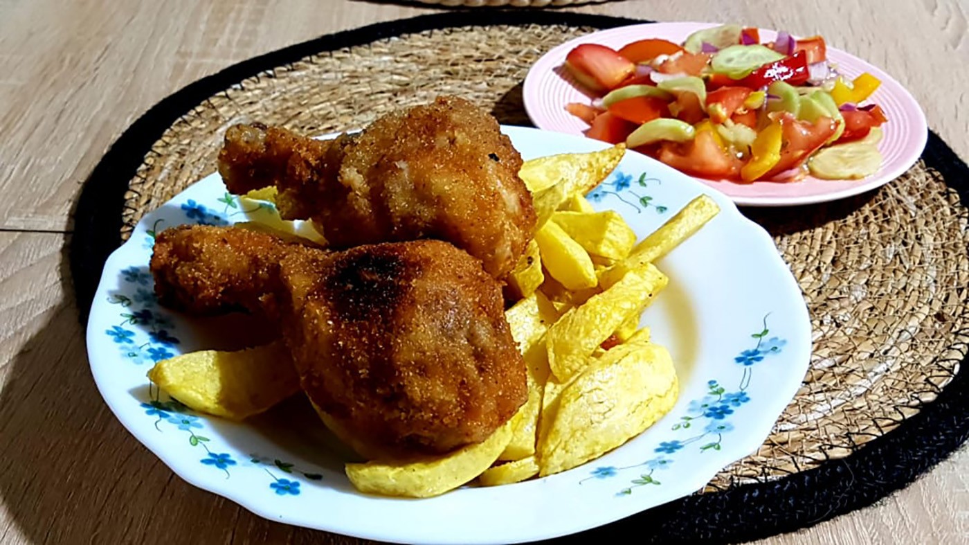 A csirkecombokat alaposan megtisztítjuk, majd a csont mindkét oldalán mélyen bevágjuk, sózzuk, borsozzuk. Egy evőkanál ketchupot egy evőkanál joghurttal, egy mokkáskanál mézzel, három cikk zúzott fokhagymával, kevés szárított majoránnával kikavarunk, a húst alaposan bekenjük vele, egy órára hűtőbe tesszük, majd lisztbe, felvert tojásba és darált sóskeksz-morzsába forgatjuk. A morzsához maradék sós perec, sós rúd is használható. Bő olajban lassú tűzön mindkét oldalát aranysárgára sütjük.