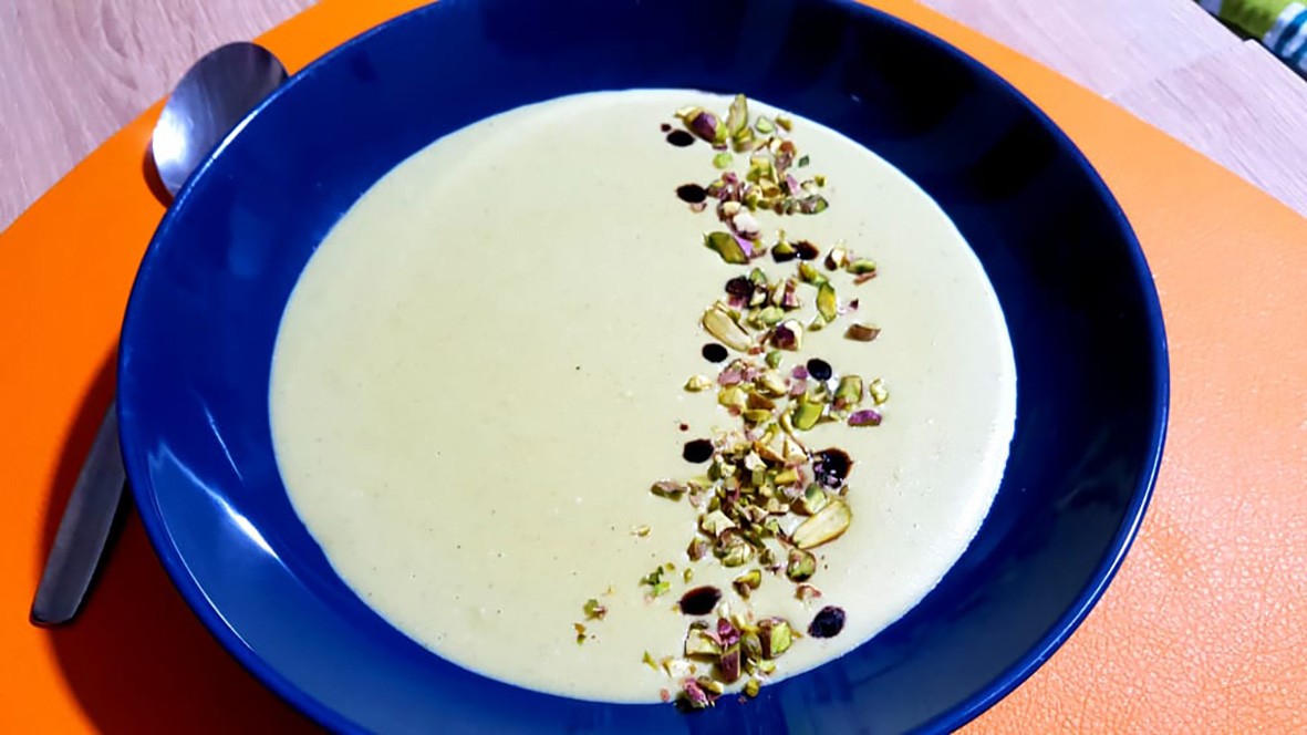Tíz darab fehér spárgát, egy kisebb fehér jégcsapretket, egy kisebb fej hagymát, két kisebb krumplit 12 dkg vajban átforgatunk. Két cikk fokhagymát apróra vágunk, 3 evőkanál száraz fehérbort és annyi vizet adunk hozzá, ami ellepi. Lassú tűzön, lefedve, puhára pároljuk. Botmixerrel krémesre kidolgozzuk. 1 dl rizstejjel és 2 dl tejszínnel egyet rottyantunk rajta. Pirított magvakkal tálaljuk. Én utoljára pirított pisztáciát vagdaltam hozzá.