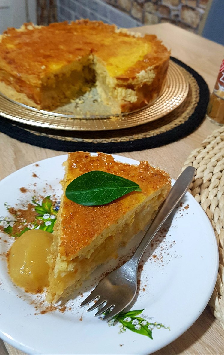 Gyors morzsasüti alapot készítek. (Akik nem szeretnek sütni, azoknak is menni fog.) 20 dkg 82%-os vajat 45 dkg liszttel, csipet sóval, 1/2 tasak sütőporral összemorzsolok. A kerek tortaforma alját és az oldalát kivajazom. A morzsaalap felét rászórom a forma aljára, megszórom 3 evőkanál zabpehellyel és 3 evőkanál barna cukorral. Erre helyezem a 3 üveg almapürét, ami kisebb almadarabokat is tartalmaz. Kb. 7 pohár almapürét (7 dl) teszek a morzsamasszára. Nekem volt saját készítésű. Ehhez szükséges 2 kg hámozott, kockázott alma, 5 evőkanál cukor, 1 pohár méz, 1 citrom leve és 1 dl víz. Folytonosan kavargatva megpároljuk kb. 10 perc alatt az almát, majd botmixerrel pürésítjük. (Én úgy szeretem, hogy kis darabkák is legyenek benne.) Miután rákenem az almapürét, 1 tasak vaníliás pudingport, 2 evőkanál darált mandulát és 1 tasak (80 g) vaníliás porcukrot hintek rá, majd rászórom a maradék morzsaalapot. 3 tojást 1 dl tejszínnel felverek, és rácsorgatom a tetejére. 180 fokon 10 percig, majd 160 fokon 30 percig sütjük. Aki édesebben szereti, az tálaláskor megszórhatja porcukorral.