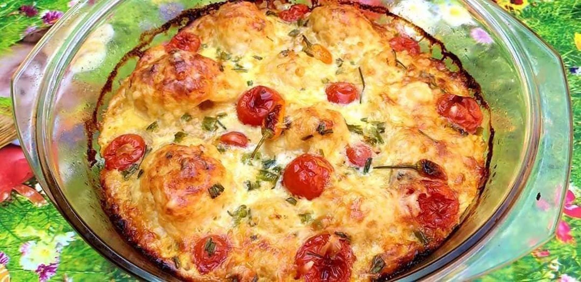 A karfiolt rózsáira szedem, és 3 percig sós vízben főzöm. A gombafejeket eközben besózom, borsozom, és kevés vajon egészben megpárolom őket (kb. 10 perc alatt), majd a gombafejekbe helyezek egy-egy karfiolrózsát. Egy jénai tálat kivajazok, a megtöltött gombafejeket belehelyezem, és cherry paradicsomokat is teszek a gombafejek mellé. Egy szelet vajat felolvasztok, 3 evőkanál lisztet 3,5 dl tejjel, szerecsendióval, sóval, fehér borssal sűrű krémmé főzök, majd kissé kihűtöm, 3 tojást és 3 evőkanál tejfölt keverek hozzá (pár cikk zúzott fokhagyma is kerülhet bele). Ráöntöm a besamellt a gombára, megszórom vagdalt metélőhagymával és petrezselyemzölddel. Sütőben 180 fokon 20 percig sütöm, majd alaposan megszórom reszelt sajttal, és pár percre visszateszem a sütőbe, hogy szép pirosra süljön. Önmagában is nagyon finom, de találhatjuk rizs vagy krumpli mellé is.