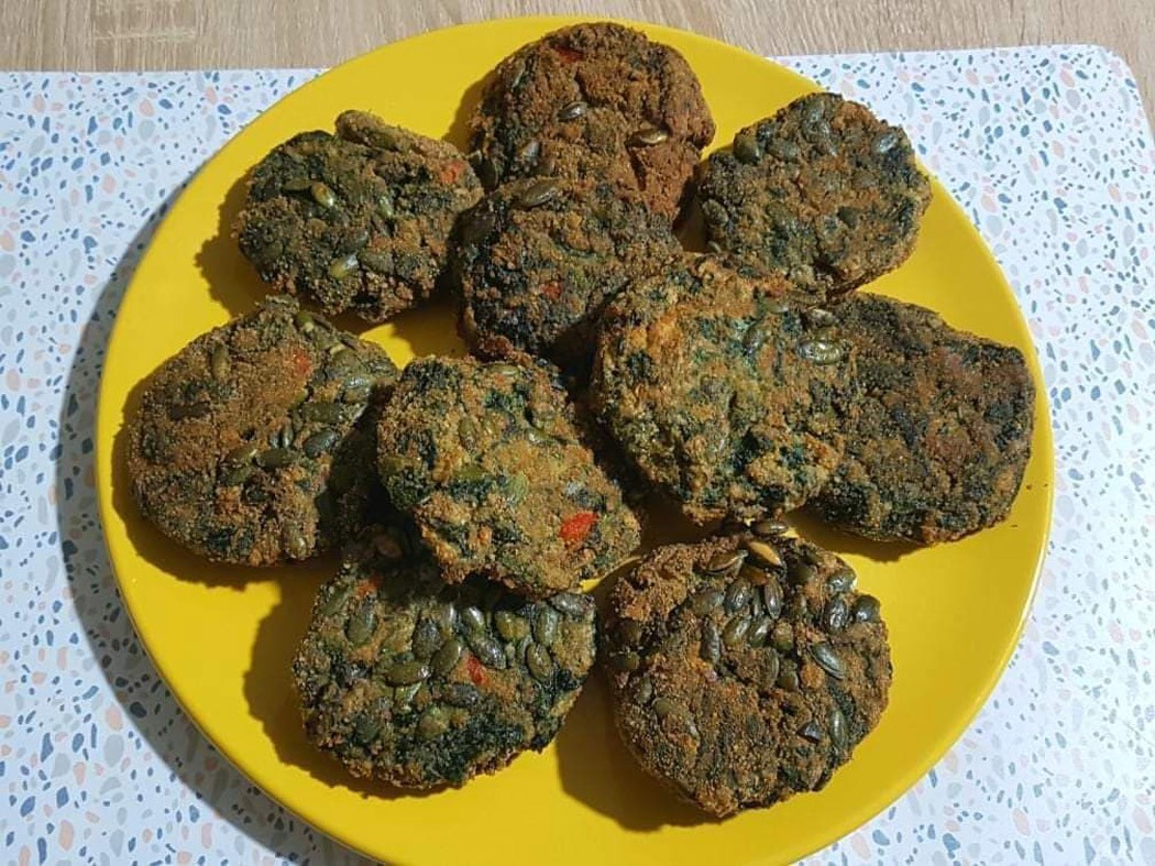 75 dkg spenótot leforrázok, majd miután leszűröm, jeges vízbe teszem, azaz blansírozom, hogy megtartsa a szép zöld színét. Vágódeszkán apróra vagdalom. 20 dkg darált csirkemellet, 1 kis darab murkot lereszelve, 4 cikk zúzott fokhagymát, 4 tojást, 1 csapott evőkanál lisztet, 2 evőkanál prézlit, 2 evőkanál finom zabpelyhet adok hozzá. Az egészet jól összegyúrom, megsózom, borsozom. Fasírtokat formázok a masszából, majd prézlibe és sütőtökmagba forgatom, és kevés olajban mindkét oldalon megsütöm. Majonézzel, mustárral, tormával kedvelem a legjobban.