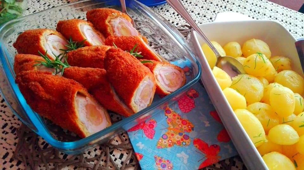 Egy nagyobb darab (25-30 dkg) csirkemellfilét apró darabokra vágunk, sózunk, borsozunk, adunk hozzá 8 dkg gorgonzola sajtot, 10 dkg reszelt gouda sajtot, egy tojást, és ízlés szerint zöldfűszerekkel ízesítjük: metélőhagymával, petrezselyemzölddel, kaporral vagy mentával. Akár külön, akár egyvelegként használhatjuk a fűszereket. A pulykamellet szeleteljük, fellazítjuk a húst, vigyázva, hogy ne romboljuk szét teljesen a rostokat. A kipotyolt húst sózzuk, borsozzuk, rákenjük a csirkehúsos-sajtos tölteléket, kétfelől behajtjuk, majd felgöngyöljük, és bepanírozzuk (liszt+tojás+prézli). Bő olajban, lassú tűzön megsütjük.