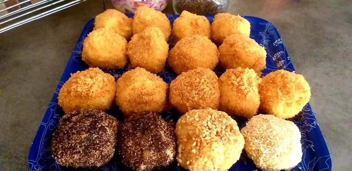 Egy kg főtt, tört krumpli, 30 dkg liszt, 2 dl olaj, ízlés szerint só, két tojássárga, egy nagyobb tojás kell hozzá. Nem serítem ki a masszát, hanem a tenyeremben szétlapítom, és a közepébe cukrozott, kimagolt meggyet, cseresznyét, kajszibarackot teszek. Vegyesen kisebb darabkákat is szoktam együtt, vagy külön-külön.