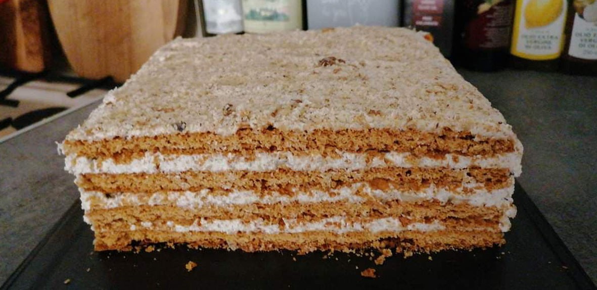 Szükséges hozzá 8 evőkanál olaj, 14 evőkanál cukor, 2 kávéskanál szódapor, 4 evőkanál méz, 10 evőkanál tej, 1 tojás és liszt, amennyit felvesz. Mindent főzónk a kályhán egy edényben, kivéve a lisztet. A lisztet akkor gyúrjuk hozzá, amikor a massza már hűlt egy kicsit. Eléggé ragadós a tészta. Négy lapot sütünk lisztezett tepsi hátán – vigyázni kell, mert gyorsan megsül.