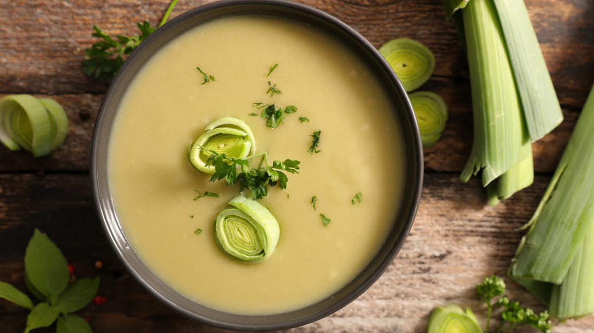 Tíz dkg vajat felolvasztunk, 1 póréhagymát karikára vágunk, sózzuk, borsozzuk. Egy nagyobb krumplit meghámozunk, kockára vágjuk, és hozzáadjuk a hagymához, kevés fokhagyma-granulátumot is szórunk rá. Feltöltjük annyi vízzel, hogy ellepje. Miután minden megpuhult, botmixerrel krémesítjük, 2 dl tejszínt adunk hozzá, és pici szerecsendióval ízesítjük.