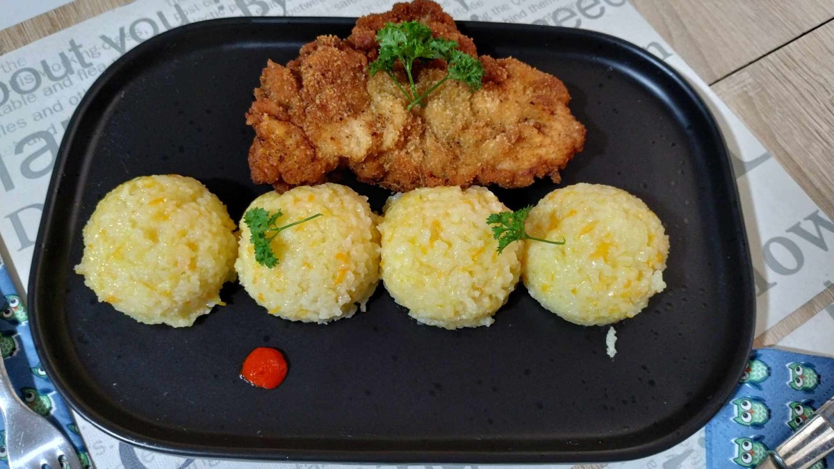 Fél kg csirkemellet felszeletelek nem túl vékonyra, majd megsózom, borsozom. Három házi tojást felverek egy evőkanál vastag tejszínnel, majd egy dl tejföllel, és két púpozott evőkanál liszttel jól összedolgozom. Apróra vágott metélőhagymát, kevés petrezselyemzöldet, két cikk zúzott fokhagymát is hozzáadok. Belehelyezem a csirkemellszeleteket, és egy órára a hűtőbe teszem. 20 dkg sós zabkekszet az aprítógépben megdarálok, egy evőkanál prézlivel összekeverem, majd a hússzeleteket a masszából kivéve mindkét oldalukon beleforgatom a kekszes keverékbe, és forró olajban aranysárgára sütöm. (Én, amíg forró, kevés citromhéjat is reszelek rá!) 15 dkg jázminrizst pici olajon kb. 3-4 percig kevergetek, majd feltöltöm annyi vízzel, hogy még egy ujjnyival ellepje. Sózom, majd forrás után, lefedve kb. 8 percet főzöm, majd félreveszem, és több konyhakendővel jól betakarom. Így hagyom állni 20 percig. 15 dkg parmezánt lereszelek, hozzákeverem, majd 5 dkg jó minőségű vajat is. Pici darált bors és kevés só mehet még hozzá. Alaposan összekeverem, és kb. 10 percig állni hagyom, hogy összeérjenek az ízek. Gombócokat formálok belőle, és tálalom!
