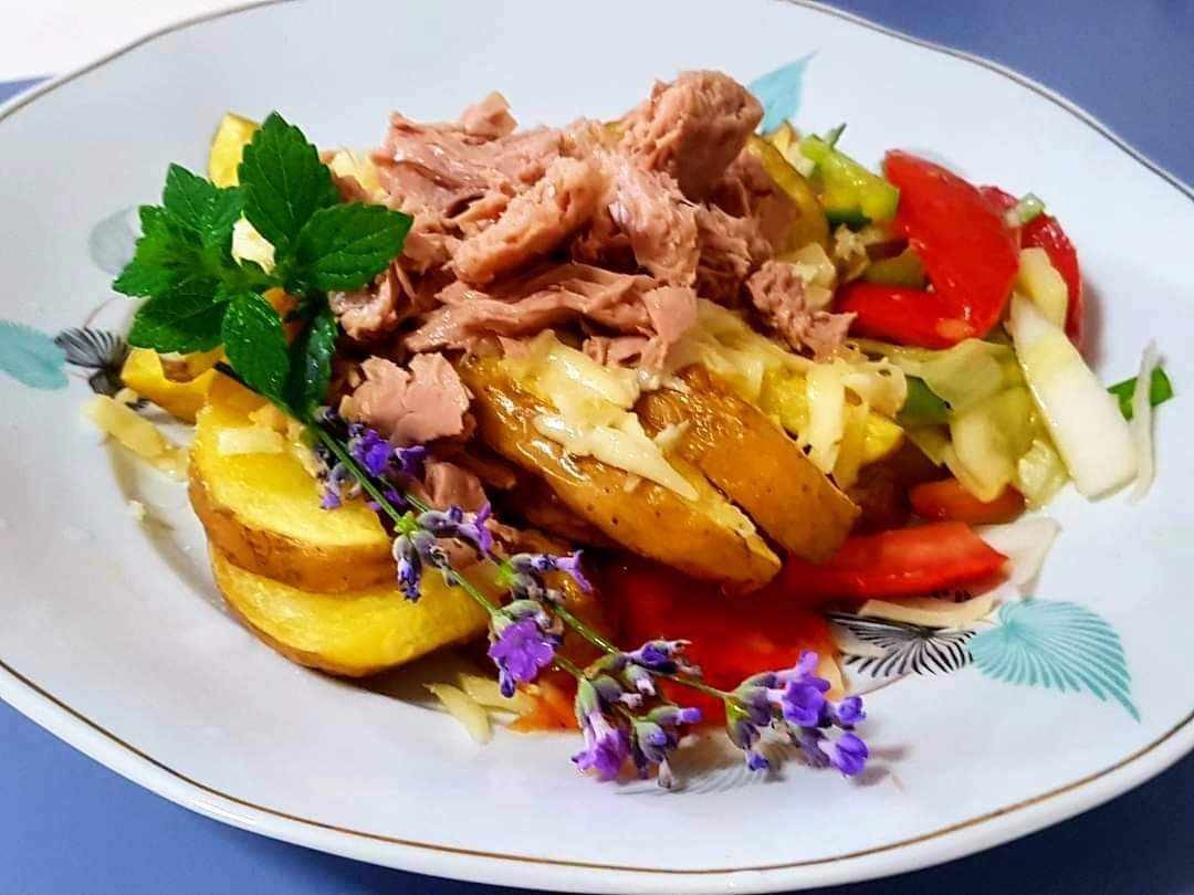 Héjában krumplit főztem, hűlni hagytam, majd négybe vágtam, de karikára is lehet (héjastul). Vajban aranysárgára sütöttem egy szál rozmaringgal, megsóztam, borsoztam, pici fokhagymaporral is megszórtam. Egy nagyobb tonhalfilét megsóztam, borsoztam, és citromlével meglocsoltam, majd vajban, lefedve, mindkét oldalán átsütöttem. Miután kicsit hűlt, villával széttépkedtem. Paradicsomot, paprikát, uborkát, hagymát tetszés szerint összevagdaltam, megsóztam, pici cukrot, ecetet, olívaolajat is adtam hozzá, és alaposan összekevertem. Legvégén a krumplit is hozzáadtam. Tálaláskor alul helyeztem a krumplis zöldséget, és rá a halat. Ha nincs halunk otthon, darabos (nem az apró, reszelt) tonhalkonzervvel is helyettesíthetjük. A levétől alaposan lecsurgatjuk, ráhelyezzük a köretünkre, de akár óvatosan össze is keverhetjük a krumplis zöldségünkkel. Az ételt citromlével és kevés reszelt citromhéjjal is megbolondíthatjuk.