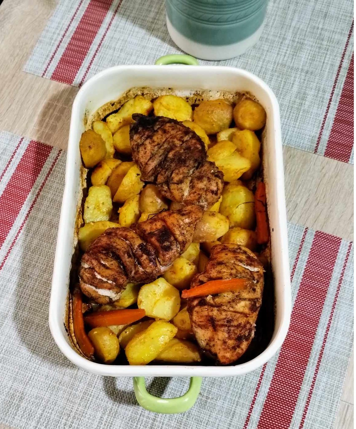Egy kg közepes nagyságú újkrumplit megfőzök héjában. Meghámozom, majd kettévágom. A tepsibe kacsazsírt teszek. A krumplit megsózom, borsozom, olvasztott vajjal, apróra vágott fokhagymával, egy kiskanál mézzel, pici pirospaprikával egy edényben átforgatom, majd a tepsibe helyezem. Egy másik tepsibe három darab bevagdalt, vastag csirkemellet teszek. Olajat, sót, mustárt, kevés Erős Pista krémet, kis kanál tejfölt, két evőkanál száraz bort, pici mézet, három gerezd zúzott fokhagymát és kevés gyömbérport jól összekeverek. Mindkét oldalát jól bekenem, ahol bevágtam, ott is. Kevés vizet, egy dl bort, pici olajat, egy evőkanál kacsazsírt teszek alája. Ráhelyezem a húsokat. Mellé rozmaringot, egy egész fej hagymát, egy fej fokhagymát, és öt-hat darab újmurkot is teszek. 10 percig lefóliázva sütöm, majd a fóliát eltávolítva, 20 perc alatt pirosra sütöm, így kívül piros, belül omlós lesz a hús. A krumpli tetejére helyezem a húsokat. A hús levével meglocsolom, és együtt, lassú tűzön még hét percig sütöm. Friss zöldségsalátával, tzatzikiszósszal vagy kovászos uborkával fogyasztjuk.