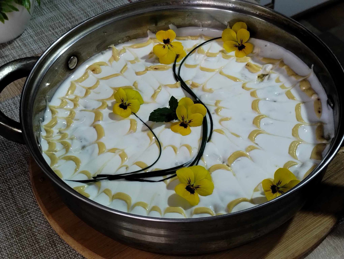 1,5 kg krumplit héjastól sós vízben megfőzünk. (Én mindig a krumpli tetejére pakolom a tojásokat is, jelen esetben 10 darabot.) Kb. 25-30 perc után leszűrjük, hűlni hagyjuk, majd meghámozzuk a krumplit is, a tojásokat. 50 dkg zsíros tejfölt, 25 dkg mascarponét, három kis, henger alakú krémsajtot, két dl növényi tejszínt, 2-3 apróra vágott mentalevelet, ízlés szerint apróra vágott metélőhagymát alaposan kikavarunk. Az edény alját kikenjük vajjal, karikára vágva rétegezzük a krumplit és a tojások felét. Sózzuk, borsozzuk. Újabb réteg krumpli, tojás jön rá, majd a tejfölös krém. A tetejére karikára vágott krumpli kerül, majd rákenjük a maradék sajtos krémet. Két tojást habosra verünk, ezt a tetejére kenjük. Sütőben sütjük, de a tűzhelyen, alaposan összerotyogtatva, kevergetve is nagyon finom lesz.