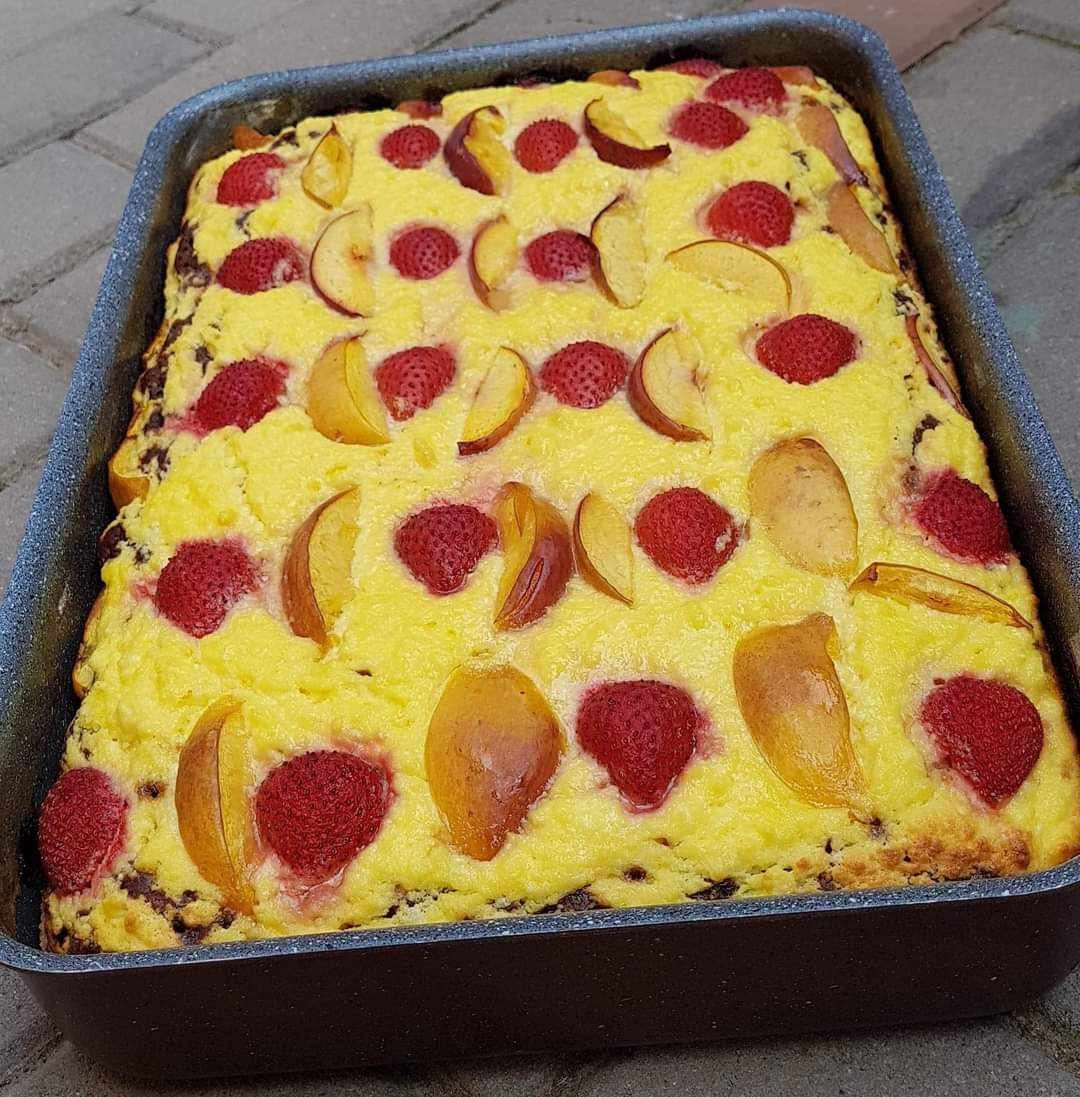 20 dkg puha margarint vagy vajat habosra keverünk 10 dkg porcukorral és egy csomag vaníliás cukorral. Hozzáadunk öt tojássárgát, egy citrom reszelt héját, a mixerrel összekeverjük, és fokozatosan hozzáadunk 30 dkg lisztet is, amelybe egy sütőport vegyítünk, majd 2,5 dl tejet. Kizsírozott tepsibe simítjuk, és előmelegített sütőben 180 C-fokon 20 percig sütjük. Kivesszük a sütőből, és rásimítjuk a málnahabot. A málnahabhoz öt tojásfehérjét egy csipet sóval és 25 dkg kristálycukorral kemény habbá verünk, a cukrot kanalanként adjuk hozzá. Ezután még keverünk hozzá két evőkanál étkezési keményítőt, két tojássárgát és 15 dkg zsíros ordát vagy 25 dkg mascarponét. Ezután 30-35 dkg nektarint szeletekre vágunk, és előkészítünk pár málnaszemet, rásimítjuk a tésztára, és még 15-20 percig 150 C-fokon sütjük. Hagyjuk kihűlni, megszórjuk porcukorral, és szeletelhetjük is.