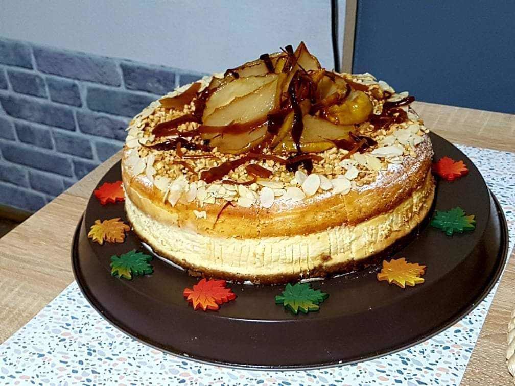 A vajas laphoz: 20 dkg vaj, 30 dkg liszt, egy tojás, 10 dkg cukor, egy evőkanál tejföl, csipetnyi só, egy citrom reszelt héja. A hozzávalókat jól összegyúrom, folpackba csomagolom, egy órára a hűtőbe teszem. Egy 22 cm átmérőjű kerek tortaformát kivajazok. A vajas masszát kinyújtom, és a tepsi alját és oldalát kibélelem a tésztával. Két érett körtét jól megmosok, kettévágom, a magházát eltávolítom, felszeletelem, és a vajas tésztára helyezem. Egy liter zsíros tejfölt 15 dkg tehéntúróval, 28 dkg porcukorral, 3 tojással, 2 tojássárgával, egy evőkanál liszttel krémessé kavarok, majd rátöltöm a körtére. Előmelegített sütőben 180 C-fokon 25 percig, majd 160 fokon még 30 percig sütöm. Miután kivettem, hagyom kihűlni a tortát. Egy érett körtét botmixerrel pürésítek, a kihűlt torta tetejére kenem, majd vagdalt, pörkölt mogyoróval és mandulával megszórom. Karamellizált körtével díszítem. Karamelizált, boros körte: két körtét hosszában nem túl vékonyra felszeletelek, 10 dkg vajat, öt evőkanál cukrot, egy evőkanál olajat, 1/2 dl vörösbort egy teflonba öntök. Ráhelyezem a körtéket, és óvatosan kevergetem. Amikor már szép színt kap a körte mindkét oldala, és gyöngyözik a cukros massza, kiemelem, és egy alufóliára helyezem a körtéket. A cukros, vajas, boros masszát addig főzöm, amíg a vaj kicsapódik, és a karamell különválik. A körtéket tetszés szerint a tortára helyezem. A karamellmasszát tetszés szerint formázzuk. Én kis szálacskákat húztam, amit a körtére, a tortára helyeztem, és azonnal megszilárdultak. A tortát csokiöntettel, lekvárral, fagyival, tejszínhabbal tálalhatjuk.
