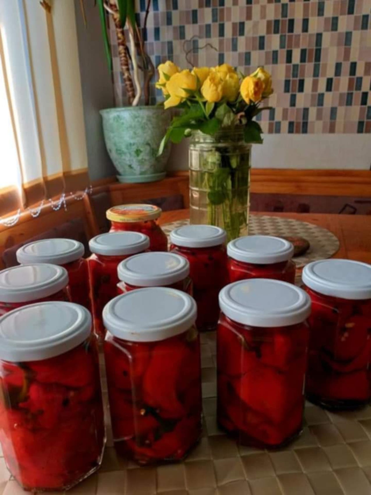 A paprikákat lemezen (grillezőn) megsütjük, akárcsak a vinettát. Hideg vízbe tesszük, így könnyen lejön a héja, majd lapítón hagyjuk hűlni. Késsel lehúzzuk a héját, a torzsáját és a magját kiszedjük (benne is lehet hagyni), majd ecetes, cukros, sós levet készítünk, amibe teszünk egy kevés nátrium-benzoátot. A levet összekeverjük a paprikával, és üvegekbe tesszük. Nem kell dunsztolni, mehet a kamrába. Az üvegek aljára mustármagot, babérlevelet, szemes borsot teszünk, tormát is tehetünk hozzá.