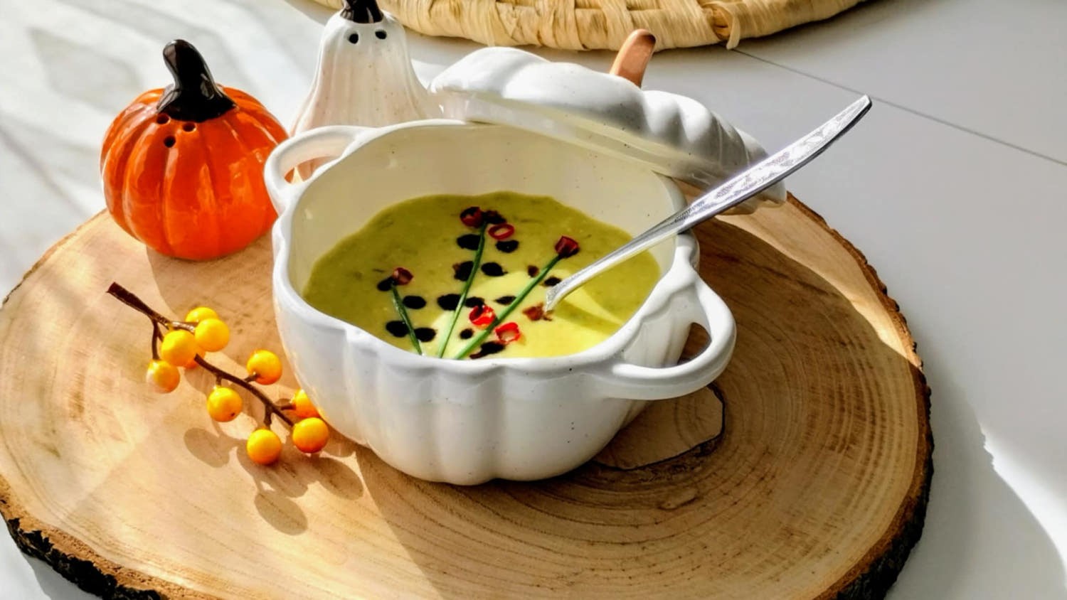 Öt dkg vajat három evőkanál olajjal felolvasztok. Nyolc szál zöld spárgát, két közepes méretű krumplit, egy jókora szelet sütőtököt tetszés szerint felvagdalok. Egy kisebb fej hagymát kockára vágok, hozzáadom a zöldségekhez, megsózom, borsozom, egy cikk zúzott fokhagymát, csipetnyi szerecsendiót adok hozzá. Feltöltöm annyi alaplével, hogy épp ellepje a zöldségeket. Lefedve puhára főzöm, majd botmixerrel krémesre dolgozom. A legvégén két dl tejszínt hőkiegyenlítéssel hozzáadok. A tálalt leves tetejére reszelt parmezánt szórhatunk, de pirított magvakkal is finom.