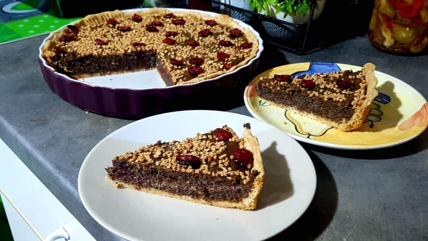 18 dkg vajból, 20 dkg lisztből, egy tojásból csipetnyi sóval tésztát gyúrok (cukrot nem adok hozzá). A piteformát kivajazom. Kinyújtom a tésztát, belehelyezem és megszurkálom, majd két evőkanál darált keksszel megszórom. 20 dkg darált mákot, egy üveg meggydzsemet (jó darabosra főzöm mindig), egy citrom reszelt héját, három dl cukrozott, sűrített tejet, két tasak vaníliát mixerrel krémesítek, és a formába töltöm. 180 fokon 40 perc alatt készre sütöm. A tetejét aszalt vörösáfonya-szeletekkel díszítem.