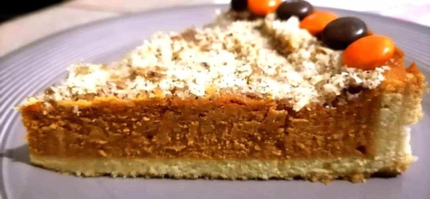 Hozzávalók: 15 dkg vaj, 10 dkg cukor, egy tojás, 25 dkg liszt, pici só, csipetnyi sütőpor. Összegyúrom a tésztát, és hűtőben pihentetem kb. fél órát. Egy kapcsos tortaformát kivajazok, az alját és az oldalát kibélelem a masszával. 10 percig elősütöm 180 C-fokon. Töltelék: 50 dkg készre főzött sütőtök, két dl tejszín, 15 dkg mascarpone, 15 dkg porcukor, két tasak vaníliás cukor, fahéj, reszelt gyömbér, darált szegfűszeg ízlés szerint, két tojás. A hozzávalókat botmixerrel kidolgozom, beleöntöm az elősütött tésztába, majd 170 fokon kb. 40 perc alatt készre sütöm. A tetejére, amikor még langyos, darált diót szórok.