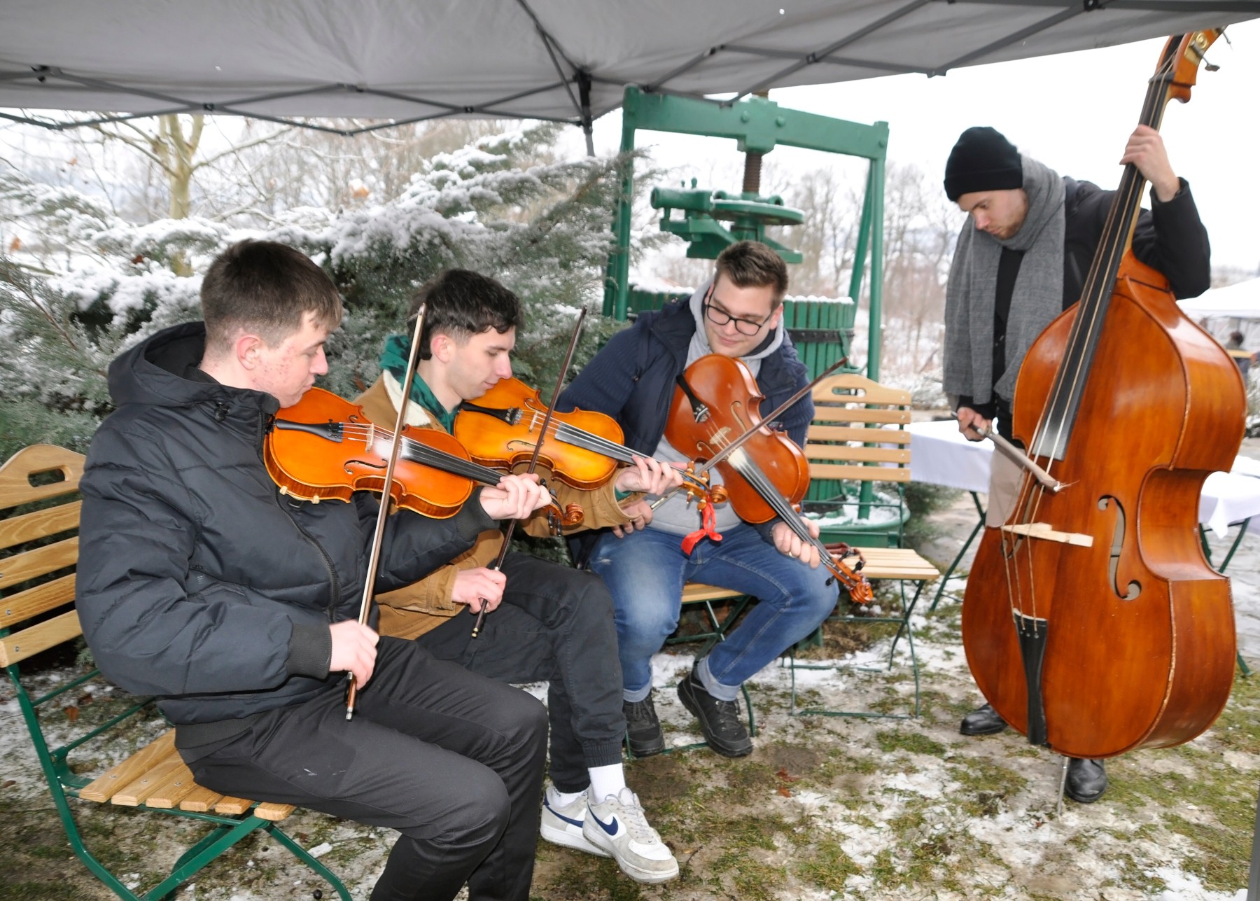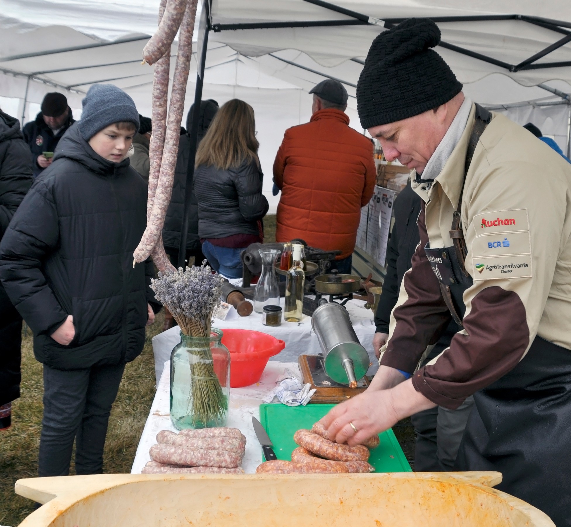 A látogatót, aki február 15-én, szombaton délelőtt betévedt a Petry Estate Winery udvarára, a Pergő Banda muzsikája fogadta. Az egyik sátor alatt ugyanis a fiatalokból álló együttes zenélt a szorgos csapatoknak, amelyek ezúttal is saját sátruk alatt, a maguk felszerelésével (személyre szabott, cég-, csapatnévvel feliratozott kötények, a feldolgozáshoz szükséges eszközök) szeletelték, darálták a húst, majd töltötte a kolbászt, amelyet több helyen is meg lehetett, sőt kellett sütni, előkészíteni a zsűrizésre.