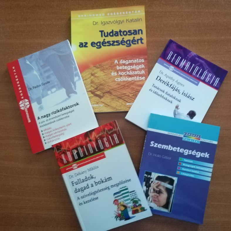 Vastagabb fehér csík a jelzi a SpringMed Kérdezz! Felelek! könyvek sorozatának köteteit. A szerzők összegyűjtötték és megválaszolták azokat a kérdéseket, amelyeket egy adott kórkép kapcsán a betegek vagy hozzátartozóik feltehetnek. Az adományozott könyvek között az urológiai betegségekről, a tüdőbántalmakról, a magas vérnyomásról, a magasvérnyomás-betegség és cukorbetegség összefüggéséről, a szembetegségekről, az utazásokkal kapcsolatos bántalmakról található meg minden szükséges ismeret szakavatott személyektől.