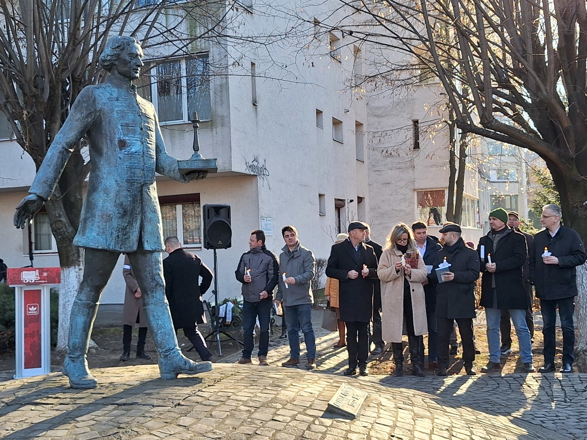 A megemlékezés zárómomentumaként a résztvevők koszorúkat és virágokat helyeztek el a kezében gyertyát és könyvet tartó Aranka György szobránál. Ezzel fejezték ki elismerésüket a felvilágosodás anyanyelvi és művelődési vezéralakja előtt. Az ő eszméit képviselték az 1990-es gyertyás-könyves demonstráció résztvevői is. Diákok és szüleik. Tanulók és tanáraik. Példájuk ezennel követőkre talált.