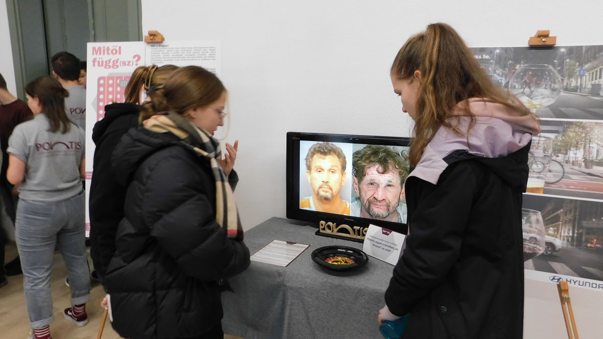 Elsőnek a különböző típusú legális és illegális, testi és pszichés tüneteket, függőséget okozó drogokat és azok hatását ismertette a fiatal rezidens orvos, és egy plakát is szemléltette mindazt, amit a kábítószer-fogyasztás negatív hatásáról, és különösen a rendkívül veszélyes dizájnerdrogokról tudni kell. Egy képernyőn pedig a kábítószer-fogyasztók testi-lelki megrokkanását, arcuk eltorzulását láthatták a nézelődők. Az ismertetésben elhangzott, hogy a fiatalokra azért veszélyesebb a kábítószer-fogyasztás, mert az idegrendszerük fejlődésben van, ezért náluk sokkal nagyobb károsodást okoz, mint a felnőtteknél. Bővebben beszélt a dizájnerdrogokról, amelyek a klasszikus kábítószerek molekuláinak mesterségesen átalakított változatai, és azért nevezik legálisnak, mert állandóan új formái jelennek meg, és nincs még rájuk törvényes rendelkezés. A legnagyobb bajt viszont az okozza, hogy sem akik terjesztik, sem akik fogyasztják és az orvosok sem tudják a pontos hatásukat.
