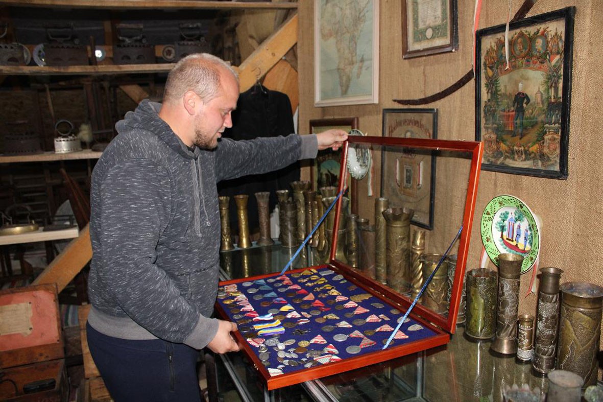 A családi padlás után kezdett bővülni a kör, először átment a szomszédokhoz, olyan helyekre, ahol tudta, hogy gazdálkodott a család, a felmenők, majd egyre messzebb jutott. A néprajzi tárgyak többnyire így gyűltek össze, házak padlásain találta meg őket, ezek mellett vásárolt is, hiszen, mint mondta, a világháborús időszakből fennmaradt tárgyakat nem igazán ajánlják csak úgy fel az emberek. Abból az időből kardok, sisakok, kulacsok, katonai emlékek gazdagítják a múzeumot, nemrég vásárolt meg egy nagyobb gyűjteményt, amely lövegvázákat foglal magába. A vasalógyűjtemény nyolcvan százalékát egy Nagybánya környékén élő gyűjtőtől vásárolta, Nyárádszereda környékéről inkább használati tárgyak származnak. Sok felajánlás érkezik, és sok, igen értékes tárgy kerül hozzá, nemrég felhívta egy Gyergyóban élő hölgy, akinek Erdőcsinádon van a családi háza, és elmondta, hogy az édesapja kovács volt, és szeretné felajánlani a tőle megmaradt eszközöket. A padlásmúzeum falait díszítő, szebbnél szebb tányérok egy református lelkész és a nagybátyja gyűjteményéből valók. A háborús sarokban egy szép kollekció található régi kitüntetésekből, korabeli pénzekből. Magyar vonatkozású, leginkább az első világháború idejéből származó érmek, kitüntetések vannak benne, amelyeket elsősorban az interneten vásárol, gyakori, hogy megöröklik a házakat Erdélyben az új tulajdonosok, utána pedig licitoldalakon értékesítik a ház padlásán talált tárgyakat.