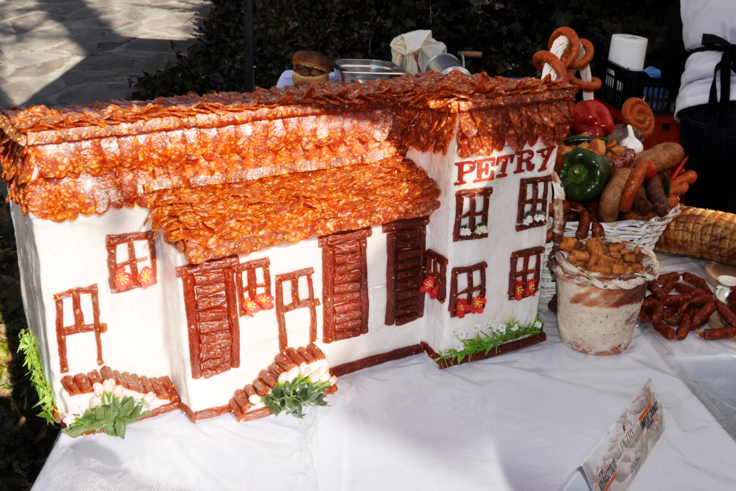 És ez utóbbi esetében a házigazdák igencsak magasra helyezték a mércét, mert az idelátogatókat egy olyan termékbemutató asztal fogadta, amelyen egy szalonnából és kolbászból álló házat is összeállítottak, így Kelementelkén érvényes volt az a mondás, miszerint „kolbászból volt a kerítés” (is). Mi több, kolbászból készített márciuskát is láthattunk.
