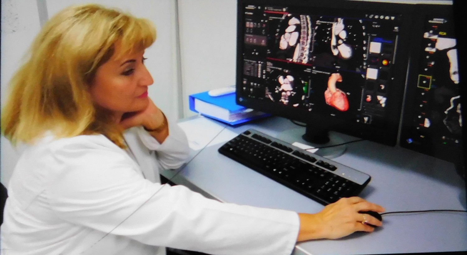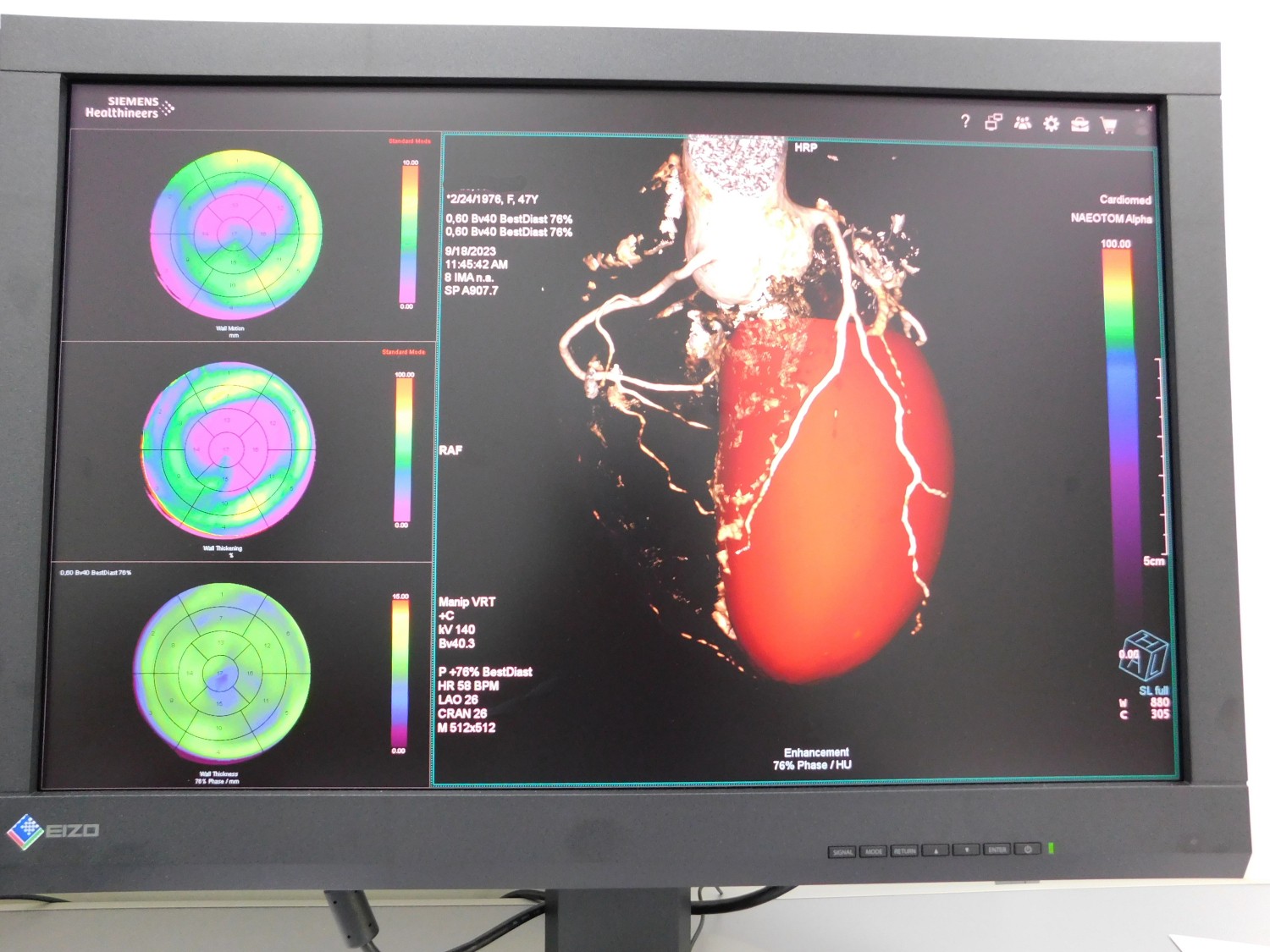 Prof. dr. Benedek Theodora belgyógyász és kardiológus főorvos mutatta be, ahogy a térben forgatni lehet az élénkpiros színben megjelenő szívet, és a felszínén lefutó hajszálerekben folytatódva a működését biztosító koszorúerek állapotát. Pontosan követni lehet, hogy hol és milyen mértékben van elzáródva a koszorúér, amely a szívizom szenvedő területét kellene vérrel ellássa. Ahol a piros szín zöldre vált, ott nem kap elég vért a szívizom, ahol azonban kék, sőt lila, ott már elhalt. Egy másik felvételen százalékokban is látni lehet a szívizom állapotát.