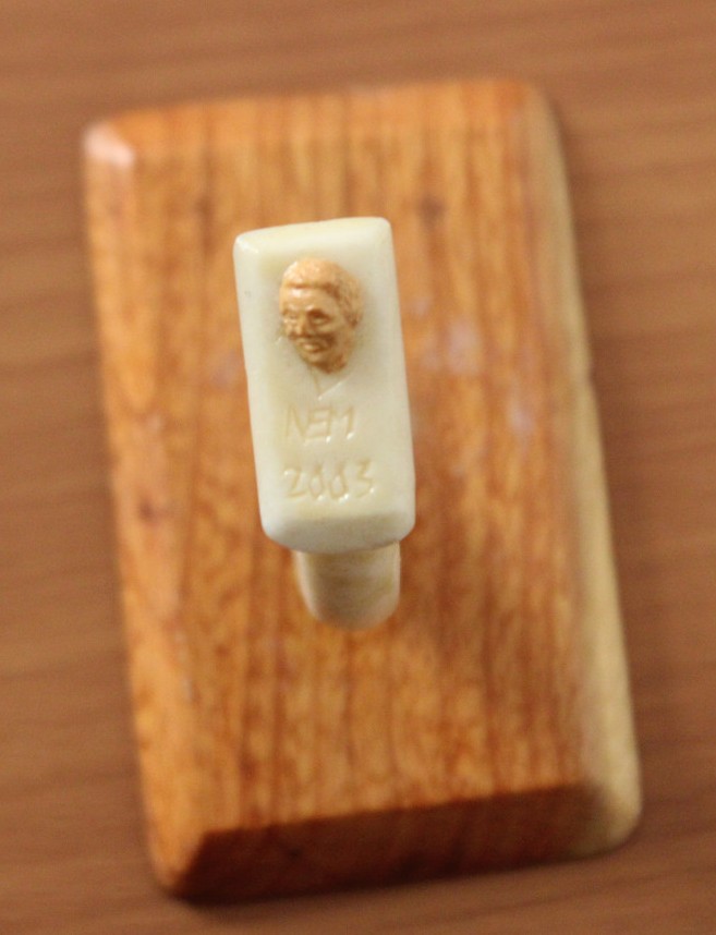 Egyedi, apró felületre, például gyümölcsmagba faragott portréi mellett több képet is hozott a kiállításra. A kedvence a törött fenyő, amelynek üzenetét így foglalta össze: