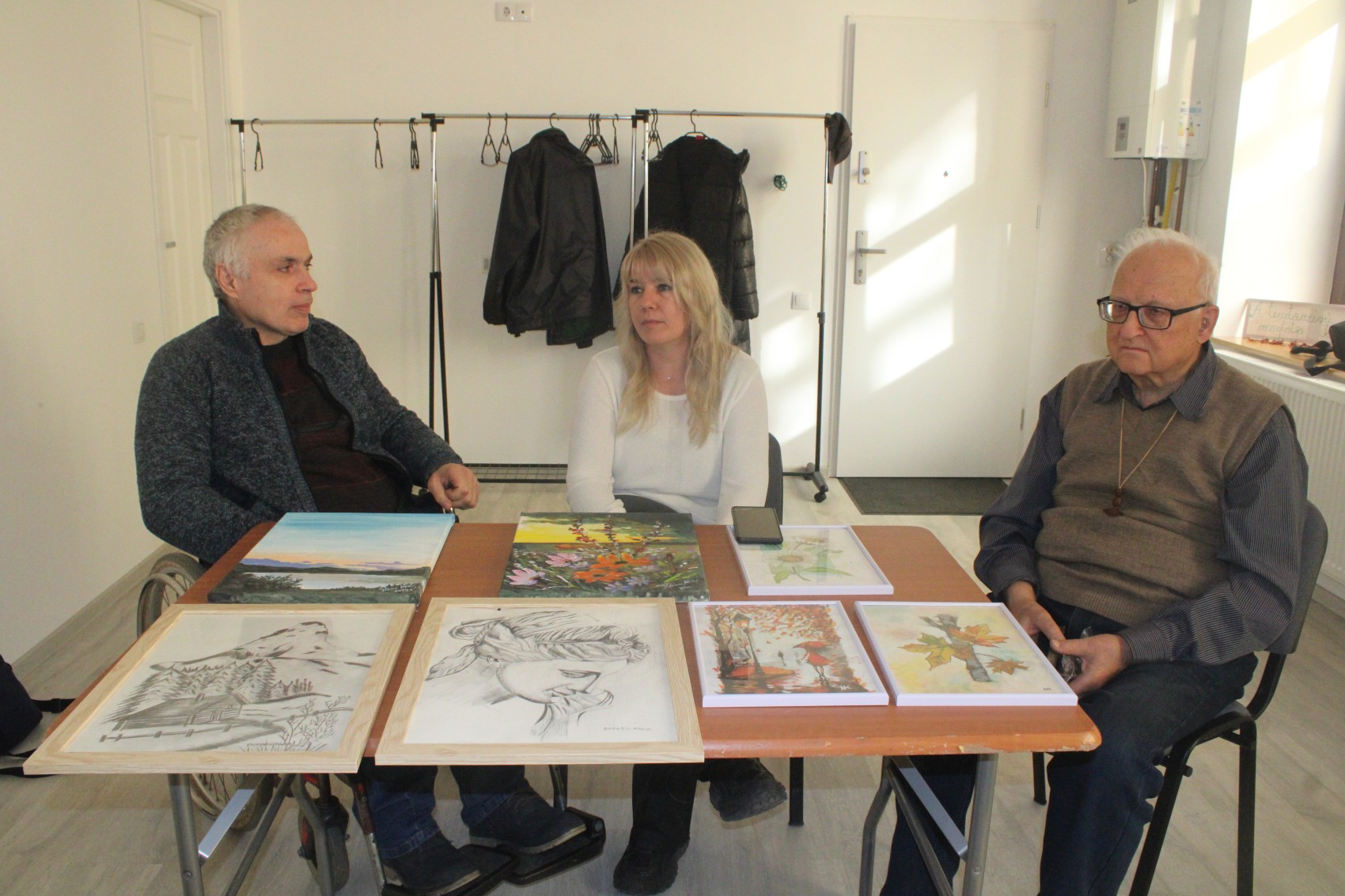 A tárlat résztvevői egy 300 lejes ajándékutalványt kaptak – tudtuk meg Csata Évától –, amiből az alkotómunkához szükséges alapanyagokat vásárolhattak. A Marosszentkirályon élő Kelemen Attila festéket, a marosvásárhelyi Nagy Elek Miklós rámákat szerzett be a jutalomösszegből – derült ki a beszélgetésen, amelyen mindkét művész jelen volt. Az együttléthez kicsivel később a szintén vásárhelyi Nagy Krisztina is csatlakozott. Rajtuk kívül a legszívesebben grafikákat készítő marosvásárhelyi Bükkösi Rózsa, a tárlaton első alkalommal részt vevő, elsődleges önkifejezési formájának a rajzolást és a festészetet érző székelyudvarhelyi Farkas Zsuzsánna, valamint a tájak és színek közötti összhangot kereső Fehér Árpád is szemnek, szívnek tetsző munkákkal gazdagította a kiállítást.