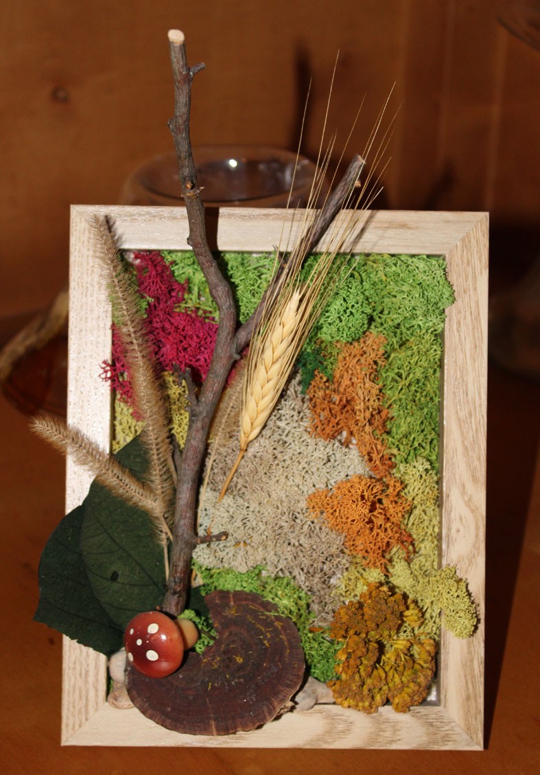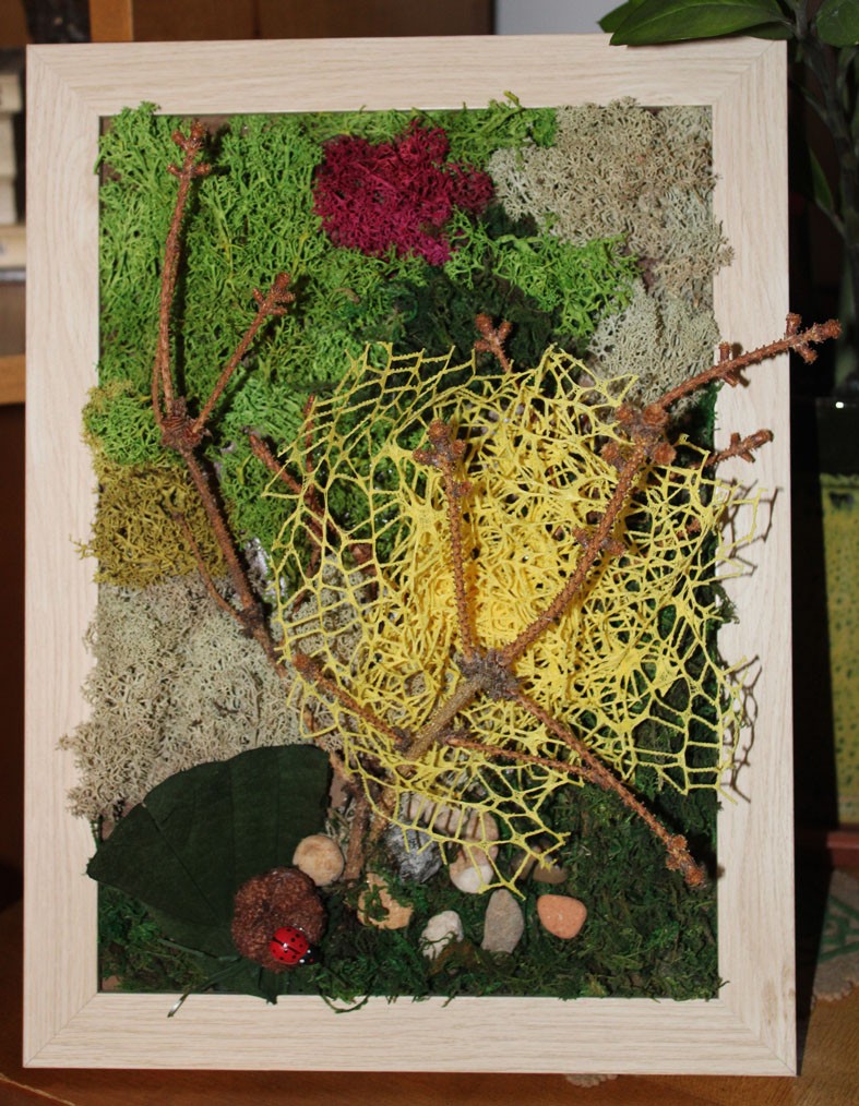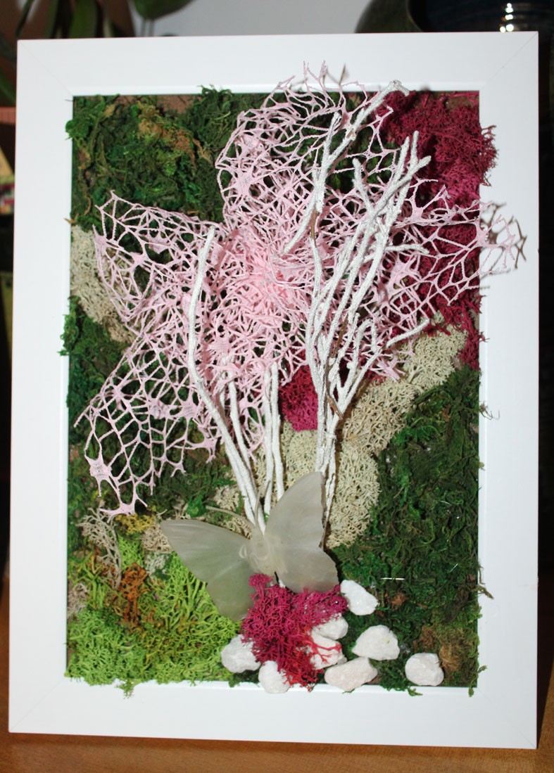 Nagyon vonzott az izlandi zuzmóval való kísérletezés, kezdetben főként ezt használtam alapanyagként a munkáimhoz. A kompozíciók összhatását gallyakkal, ágacskákkal, kagylókkal teremtettem meg, sőt, még parafadugó is került némelyikre. Kicsivel később tértem át a filcre, ami egészen más technikát igényel – vágni, varrni is kell –, a zuzmós képekkel közös jellegzetessége a térhatás.