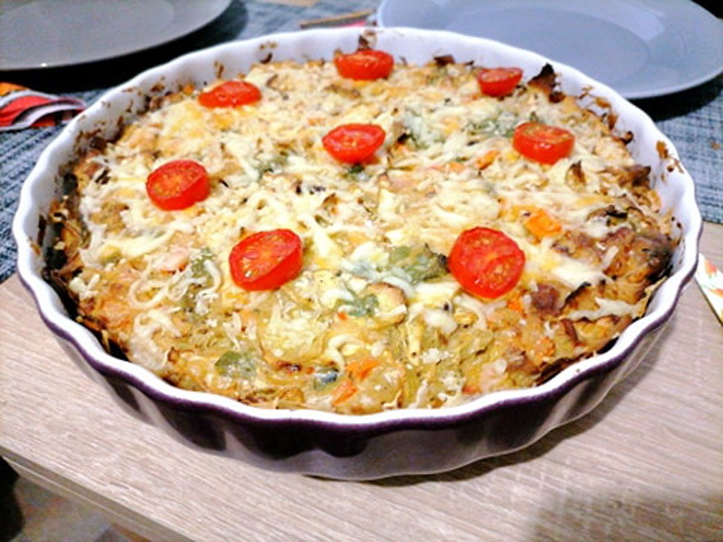 Egy kis fej friss káposztát nagyobb darabokra felkockázunk. 50 dkg csirkemellet, 1 nagyobb murkot, 1 fej hagymát szintén felkockázunk. 2 evőkanál olajat, 3 evőkanál lisztet, 4 tojást, 2 dl tejfölt, sót, darált borst, ízlés szerint zúzott fokhagymát, kevés fűszerpaprikát, pici szerecsendiót adunk hozzá, mindezt jól összekeverve. (Én most kerámiatálat használtam, de jénaiba, tepsibe is tehetjük.) Kacsazsírral jól kikentem az edényt, majd a masszát beleöntöttem, és 180 fokon, 50 perc alatt készre sütöttem. Reszelt sajttal megszórtam, majd 2 percre visszatoltam a sütőbe. Miután elkészült, szeleteljük, majd salátával, de bármilyen körettel fogyaszthatjuk.