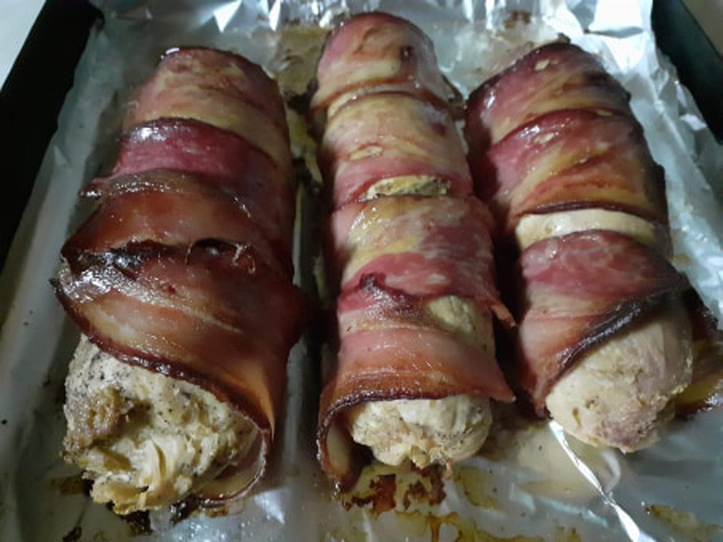 A csirkemellet szétnyitjuk, lazán megpotyoljuk, sózzuk, borsozzuk. 2 egész csirkemellet használunk, amiből 4 darabot kapunk. 30 dkg darált húst fűszerezzünk sóval, borssal, fokhagymával. A kipotyolt csirkemell élére rákenjük, majd szorosan alufóliába tekerjük, a két végét szorosan elzárjuk, mint a szaloncukrot. Bő vízben mind a négy darabot egy órán át főzzük, majd kiemeljük, kiöntjük, és picit hűlni hagyjuk. A tekercseket baconnal begöngyöljük, és tepsibe téve, sütőben kb. 20 percig sütjük.