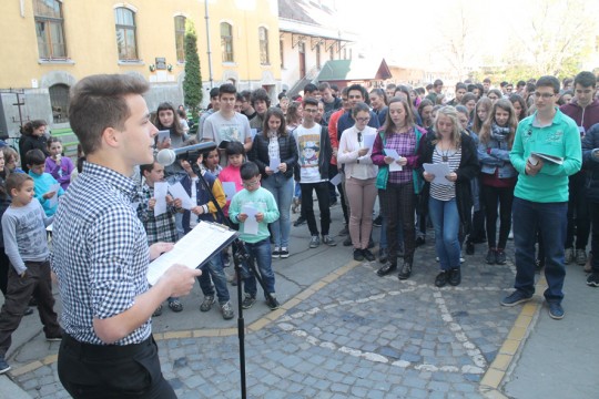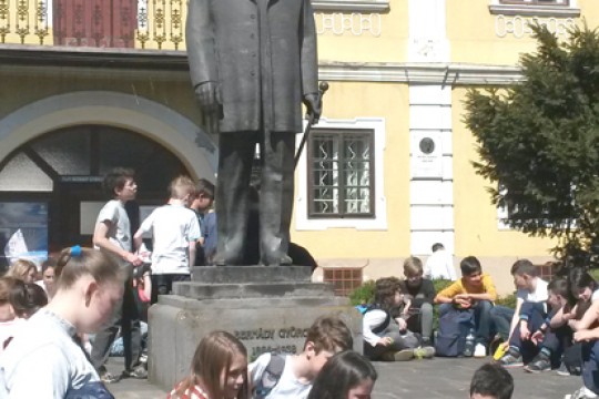 A marosvásárhelyi Dr. Bernády György Általános Iskola ötödikesei a névadó szobránál április 10-én, B...